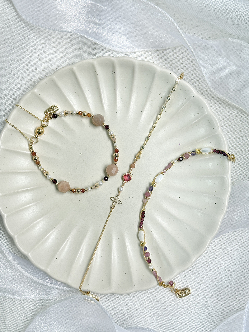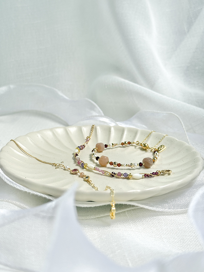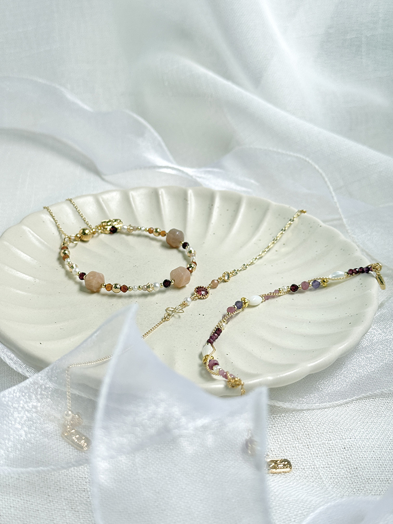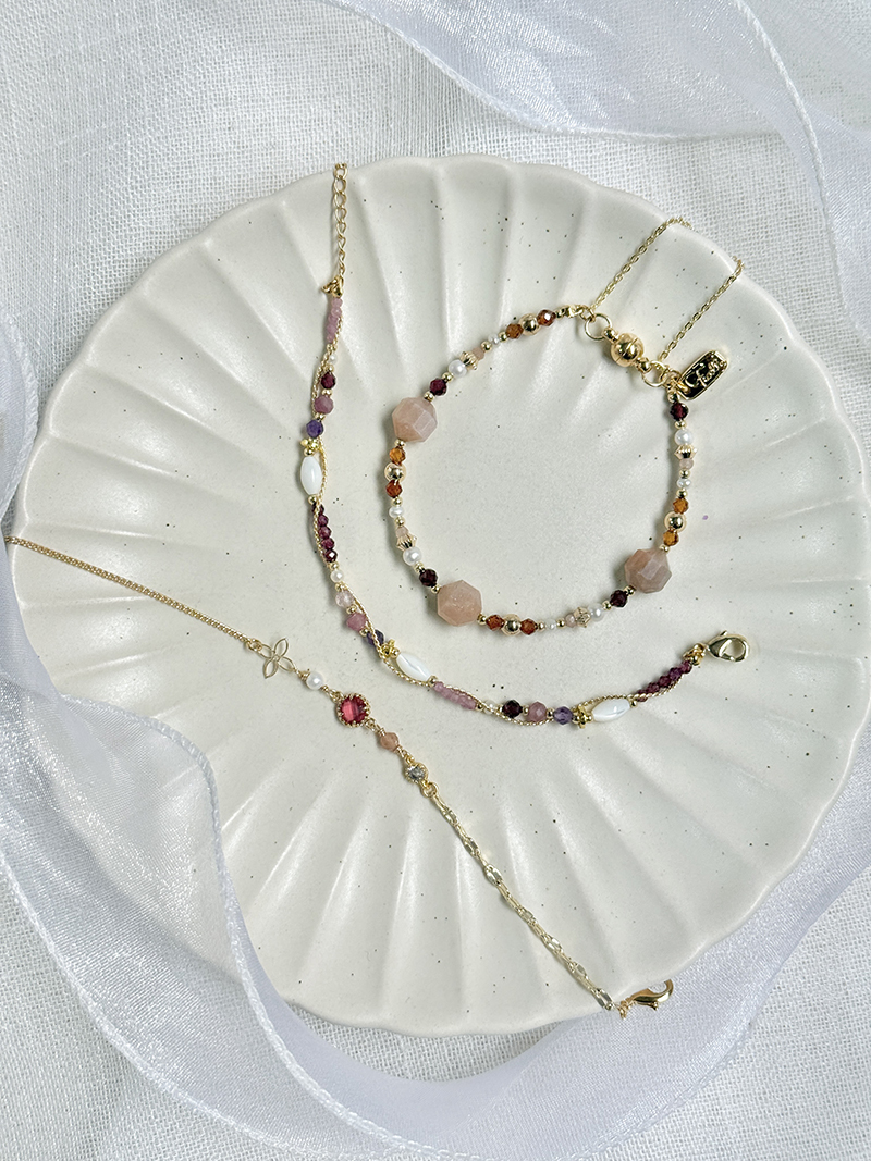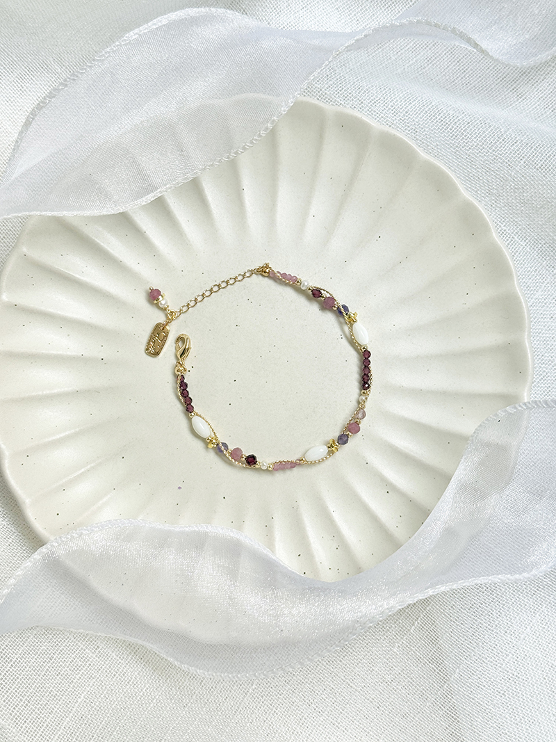 白蝶貝、石榴石、粉碧璽、紫水晶、淡水珍珠、黃銅鍍18K金