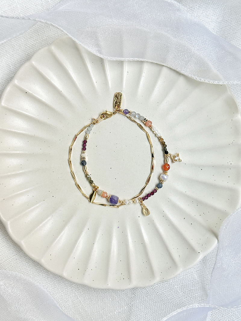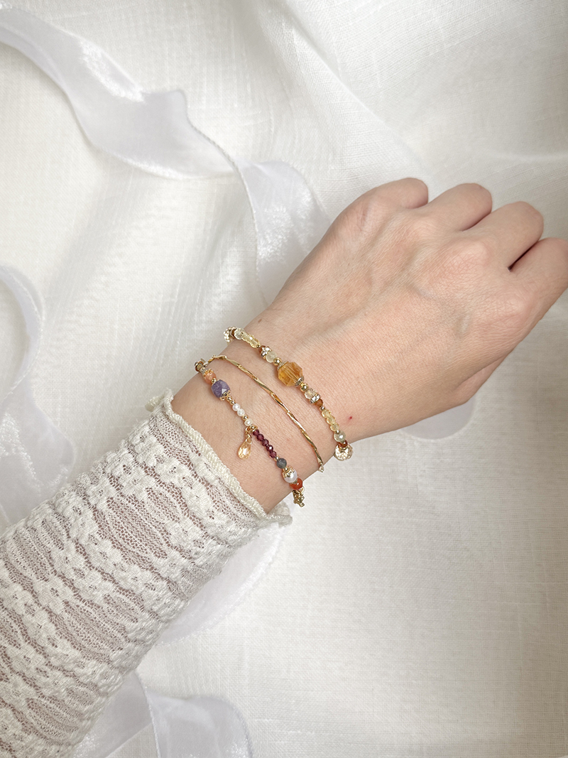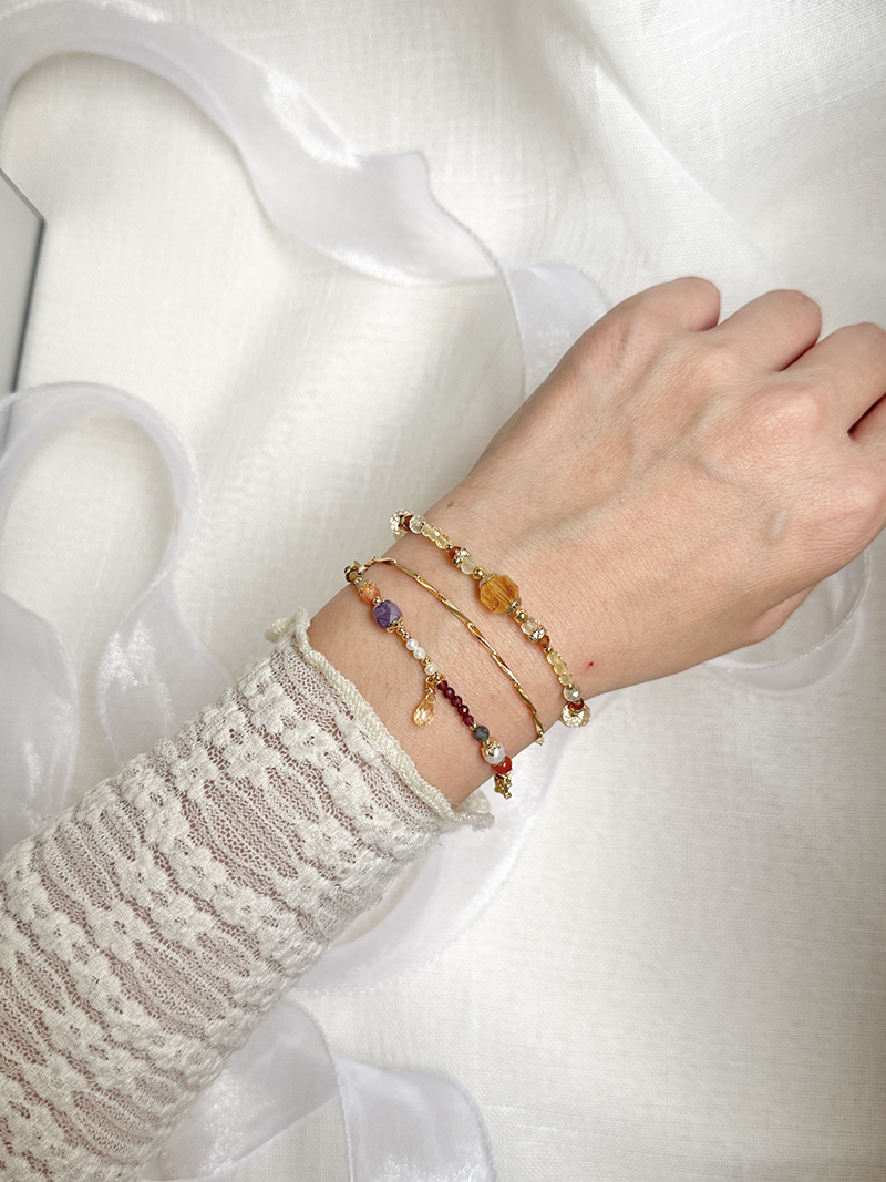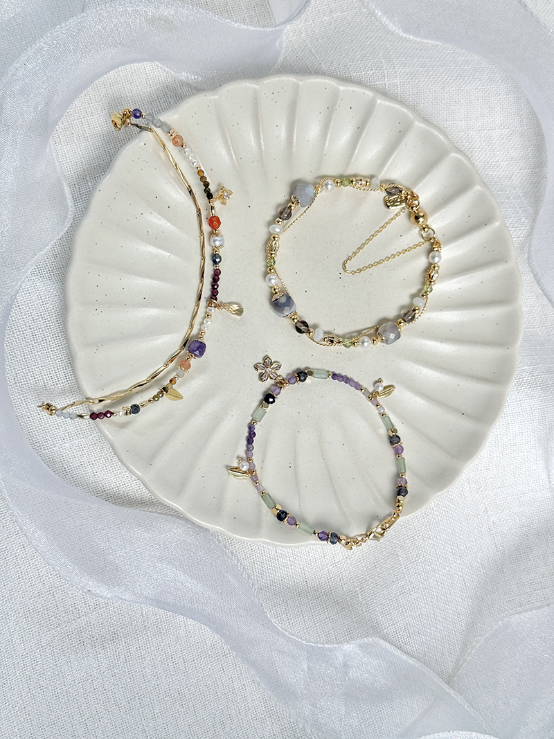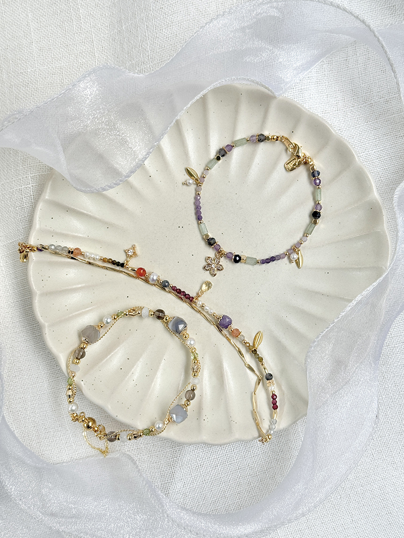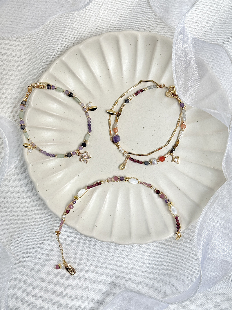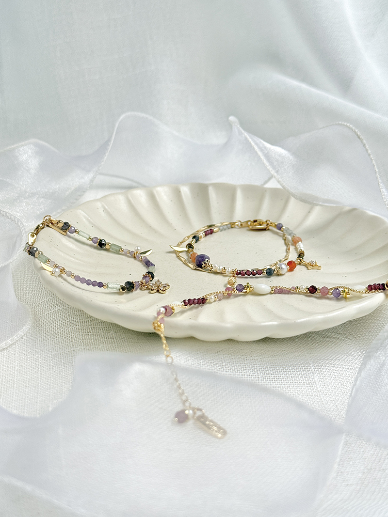 黃水晶、金草莓晶、紫鋰輝石、綠碧璽、石榴石、藍鋯石、黃碧璽、紅瑪瑙、淡水珍珠、拉長石、黃銅鍍18K金