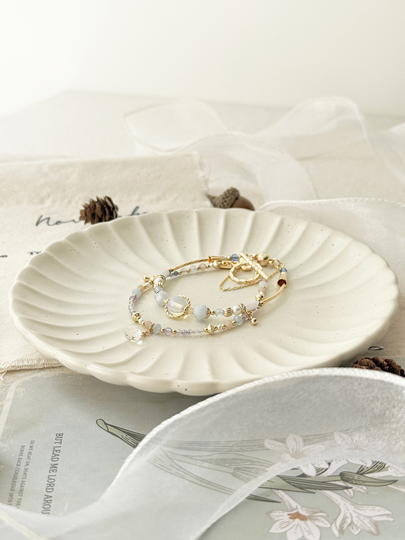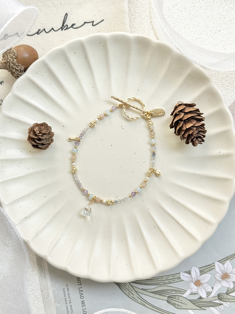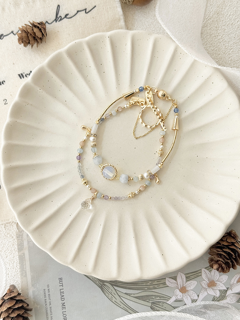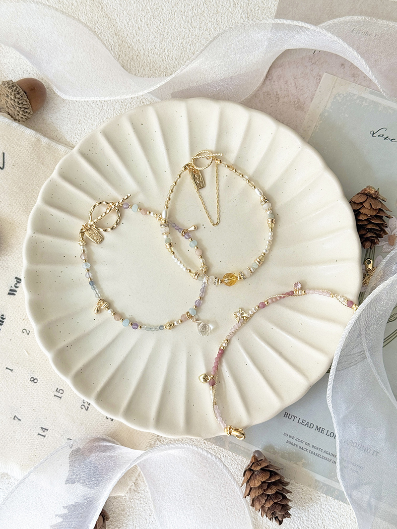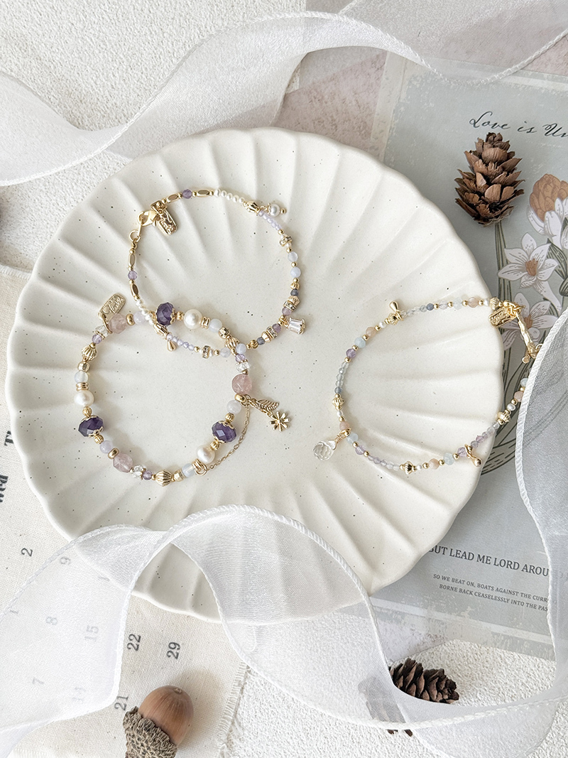 海藍寶、紫水晶、太陽石、螢石、淡水珍珠、石英石、黃銅鍍18K金
