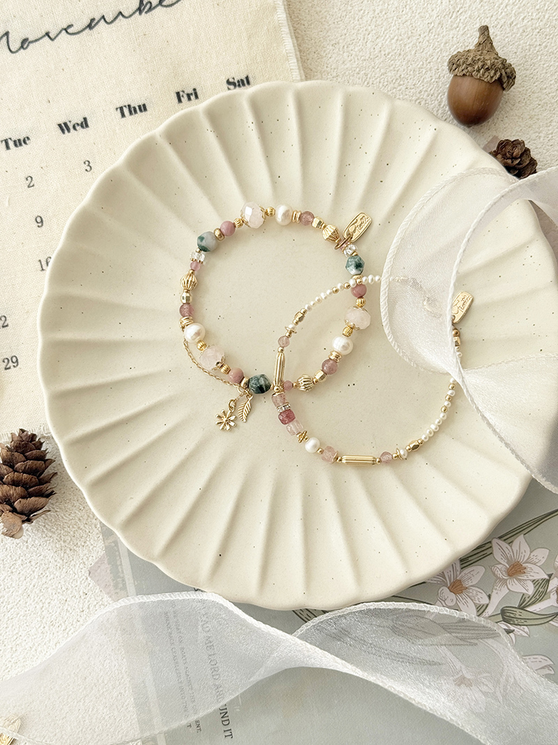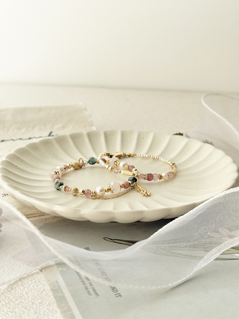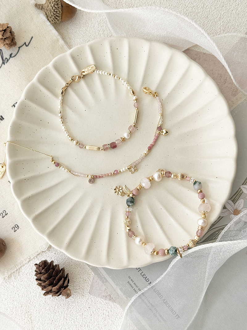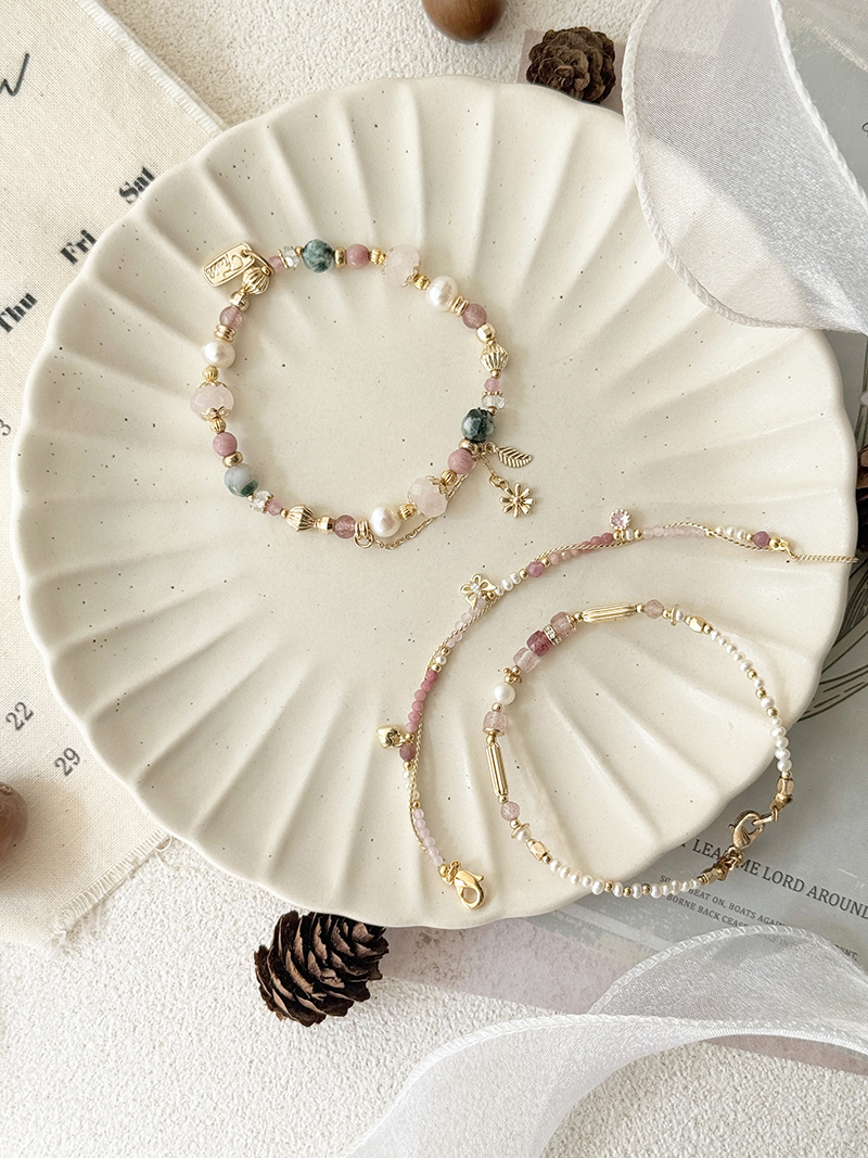 粉晶、紅紋石、水草瑪瑙、白水晶、粉貓眼石、草莓晶、淡水珍珠、黃銅鍍18K金