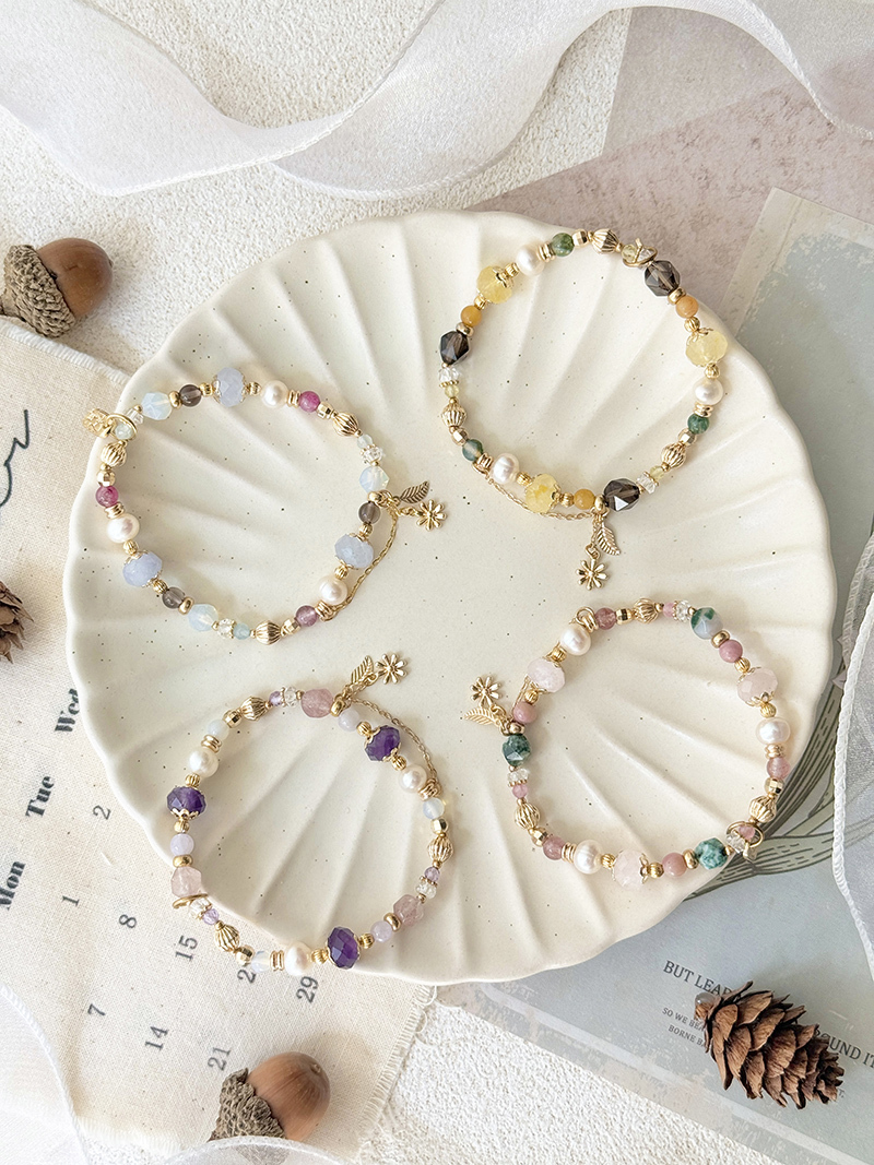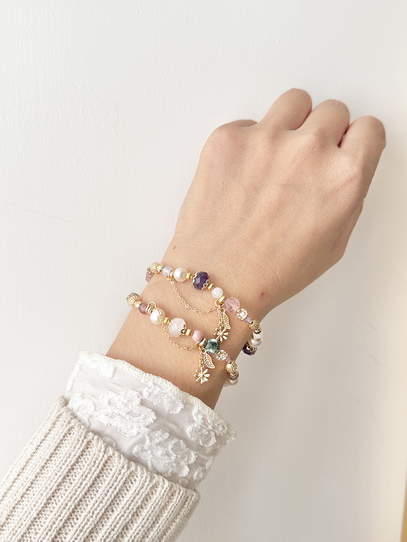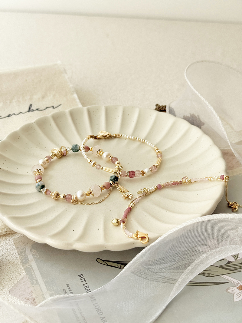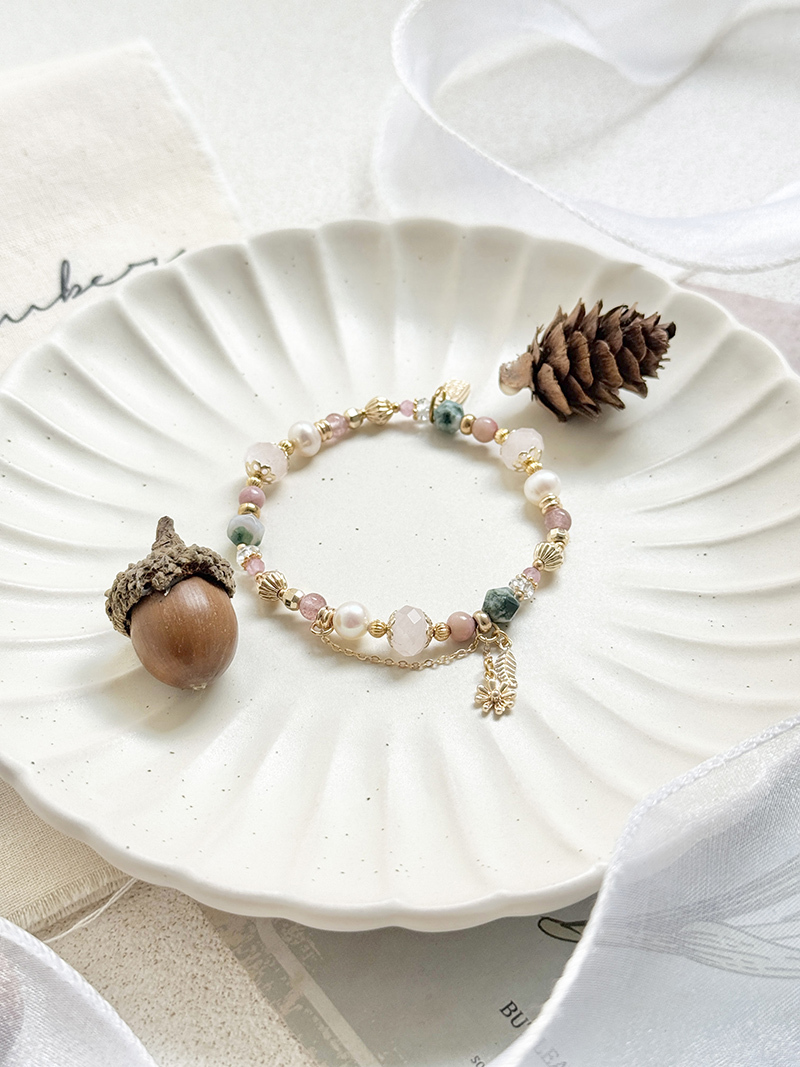 粉晶、紅紋石、水草瑪瑙、白水晶、粉貓眼石、草莓晶、淡水珍珠、黃銅鍍18K金