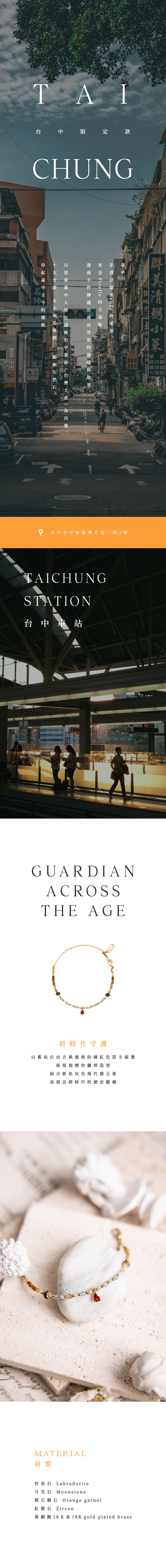 臺中,是設計師Wendy的家鄉,本系列以貫穿臺中人歷史縱橫的中港路(台灣大道)為出發,十大分段、五大知名地標、一顆顆天然石,串起臺中古今的樣貌。