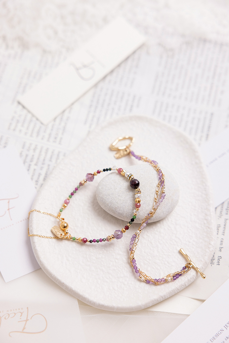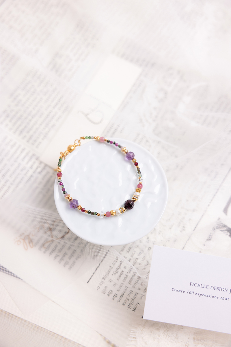 石榴石、紅綠寶石、粉碧璽、紫水晶、白水晶、黃銅鍍18K金