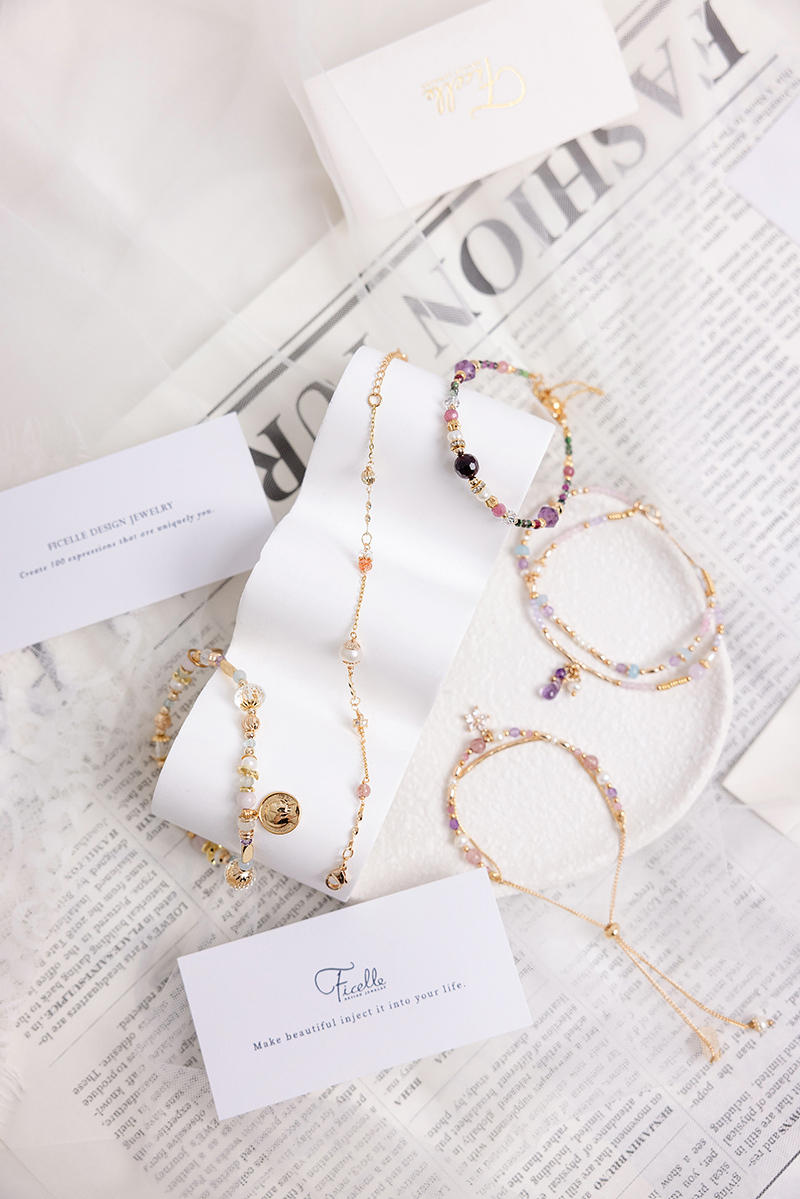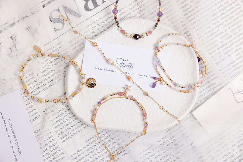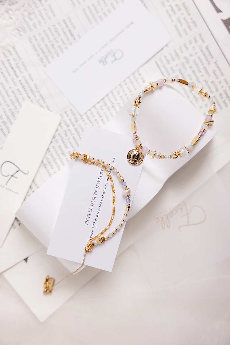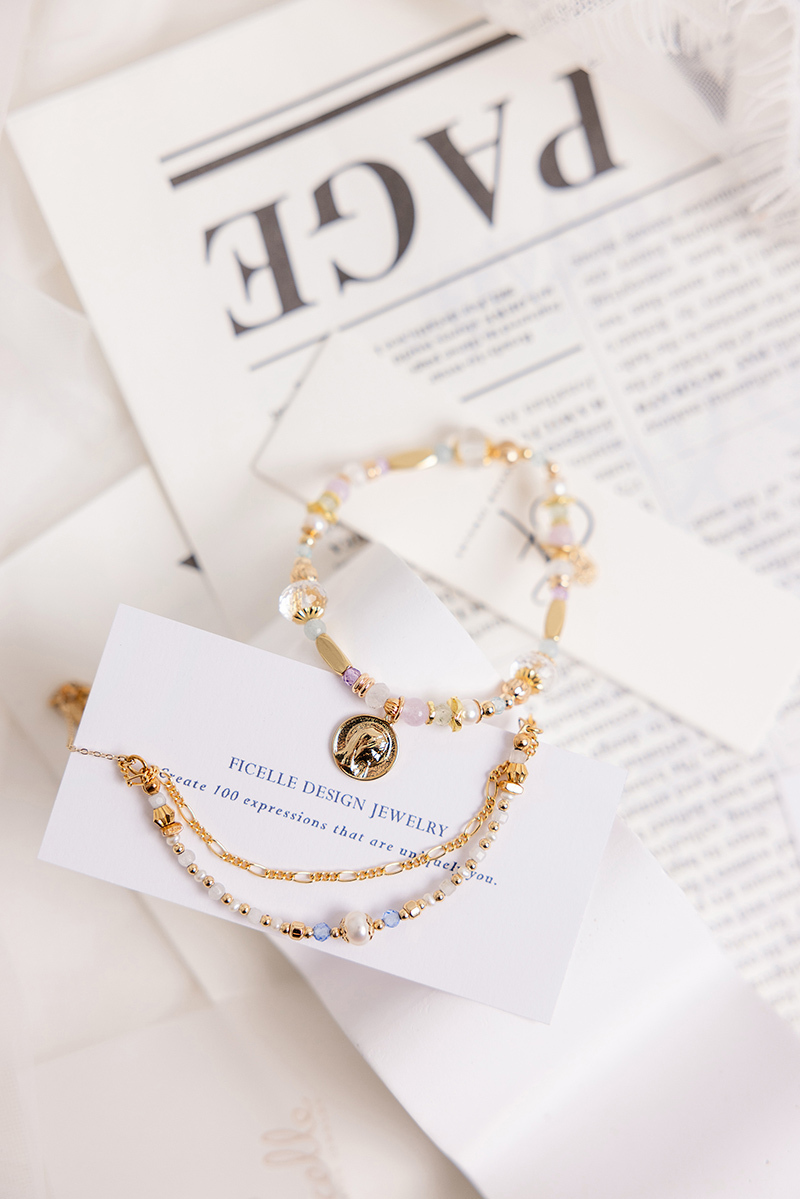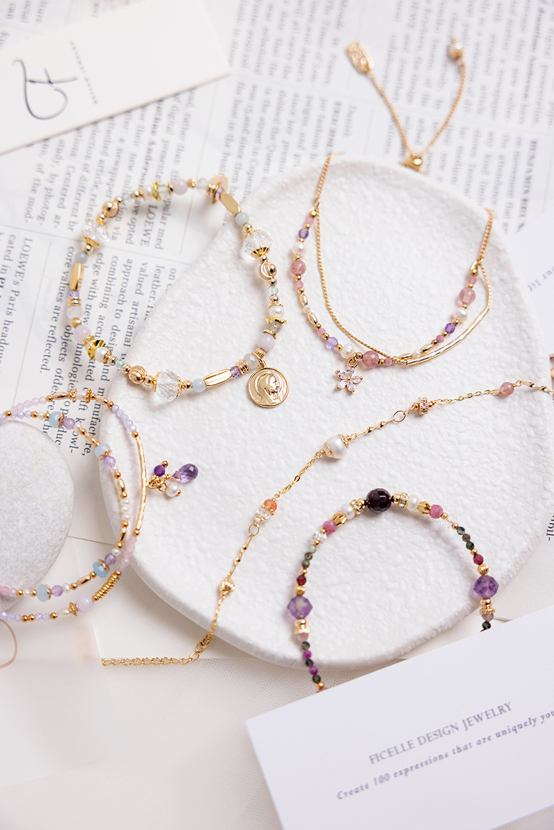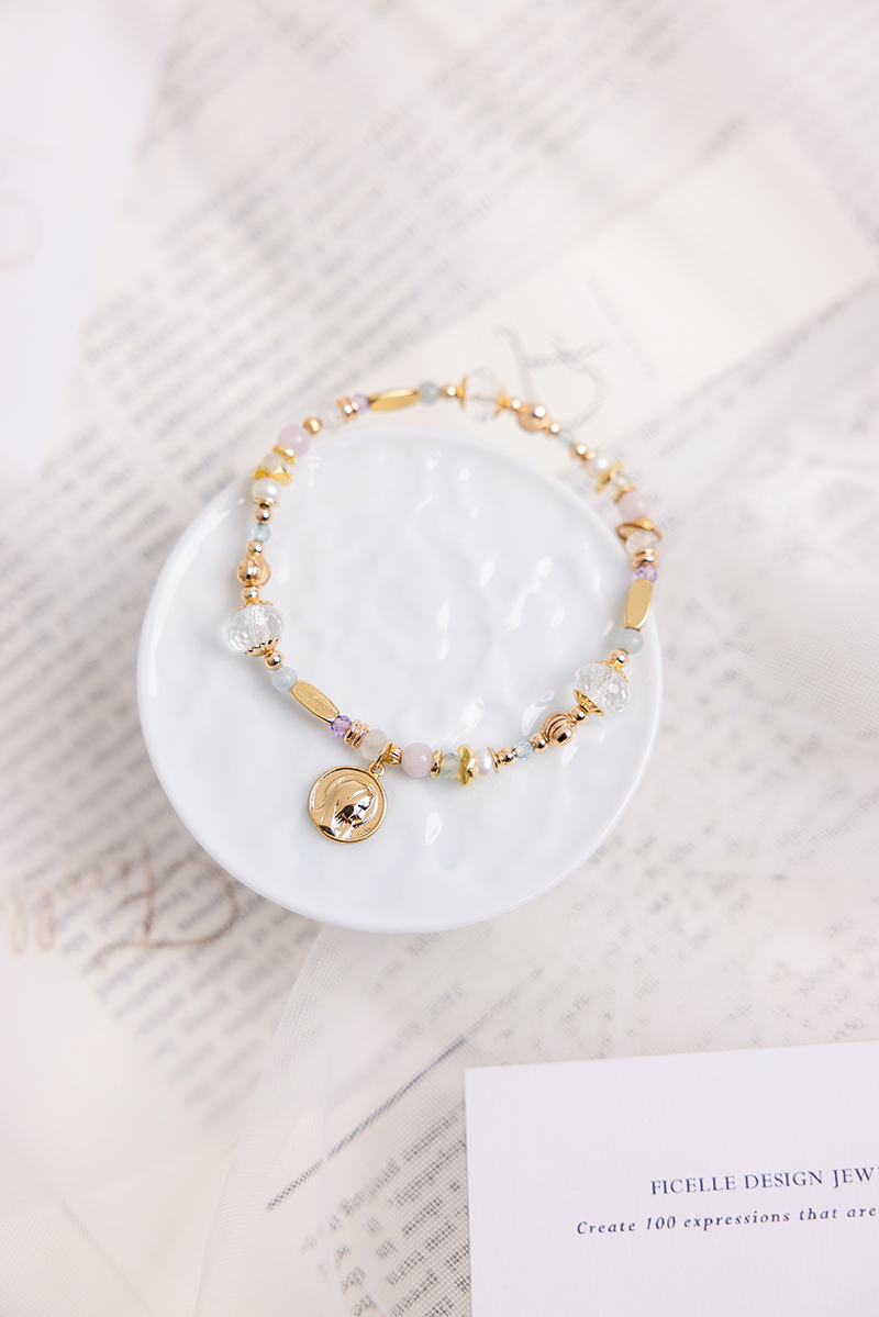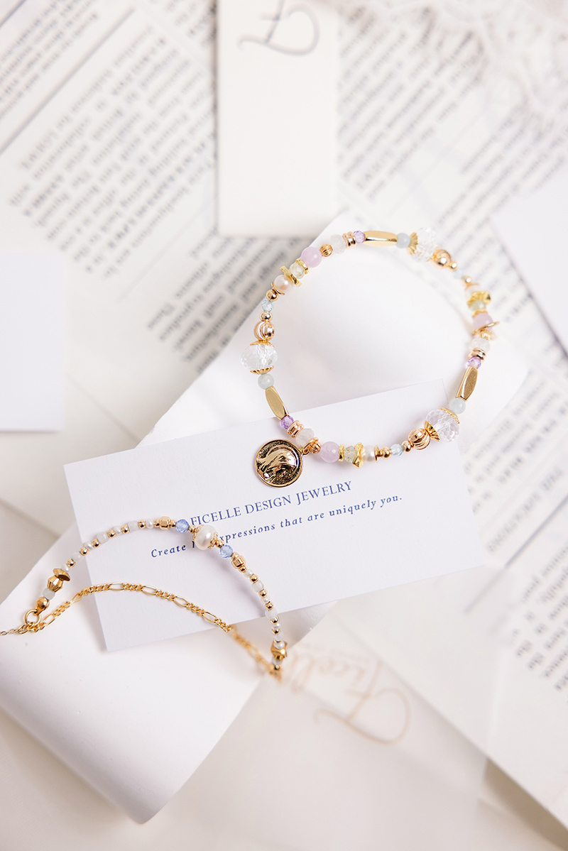 白水晶、磷灰石、淡水珍珠、葡萄石、紫水晶、月光石、海藍寶、黃銅鍍18K金