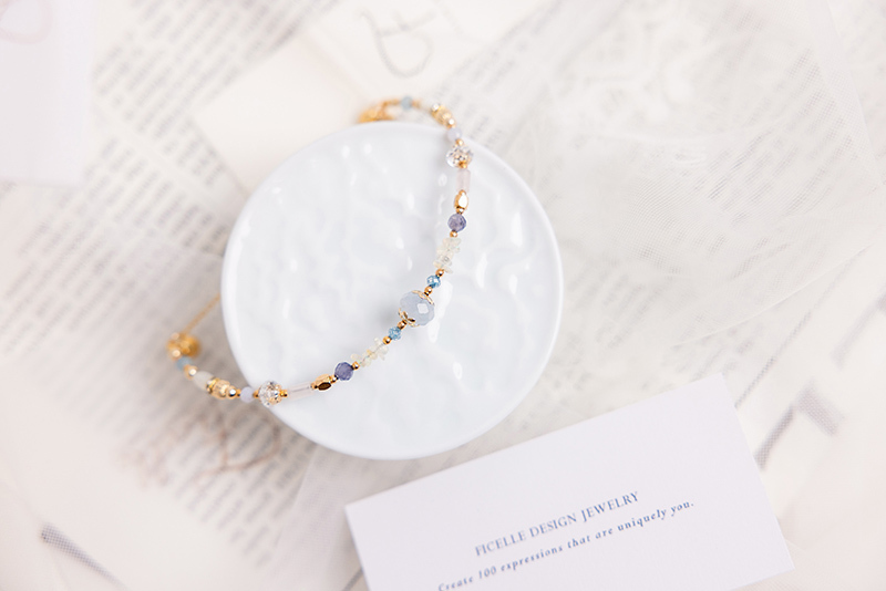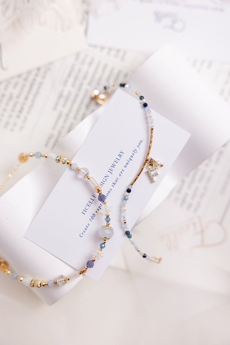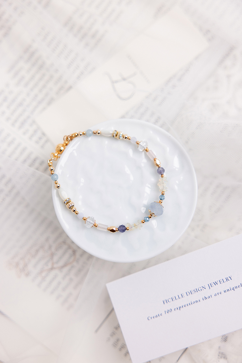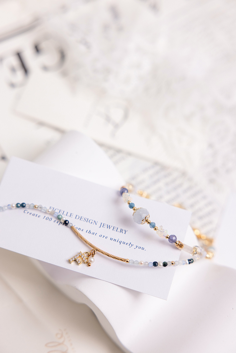 海藍寶、藍鋯石、蛋白石、堇青石、粉晶、白水晶、藍紋瑪瑙、白蝶貝、黃銅鍍18K金