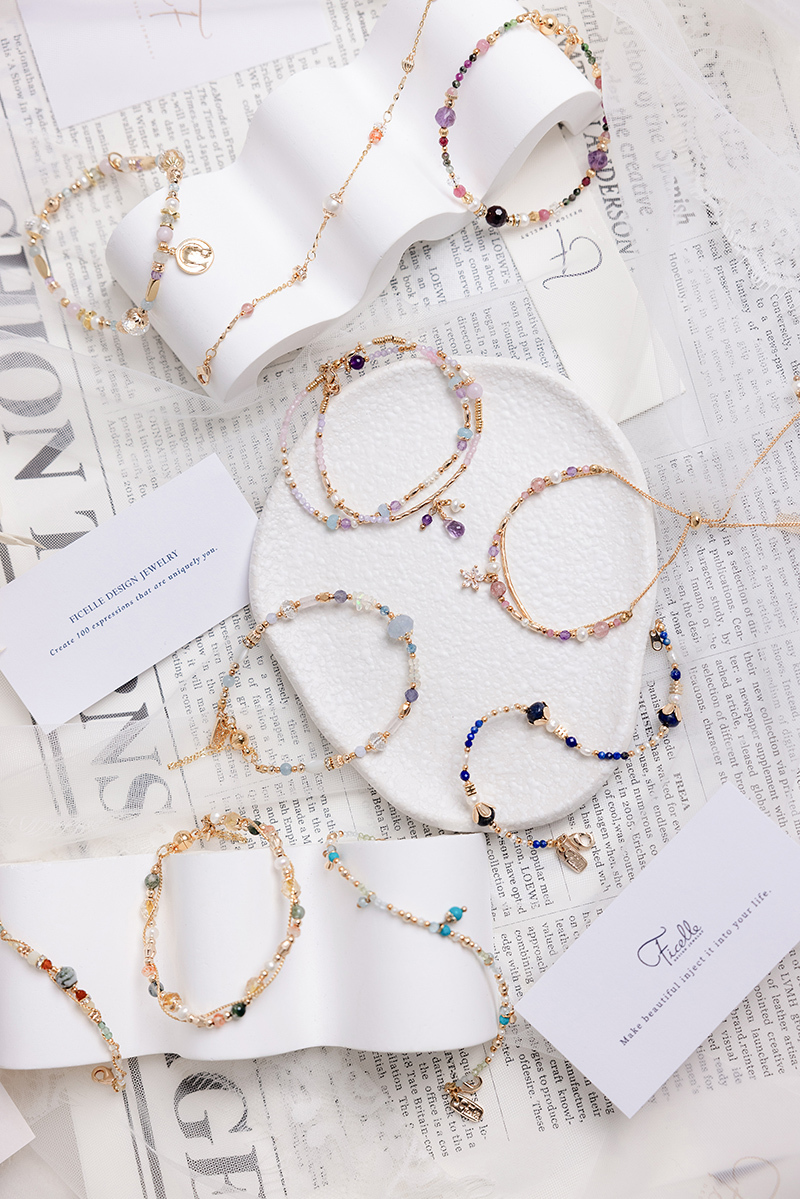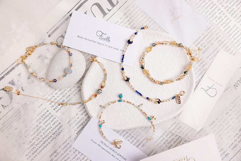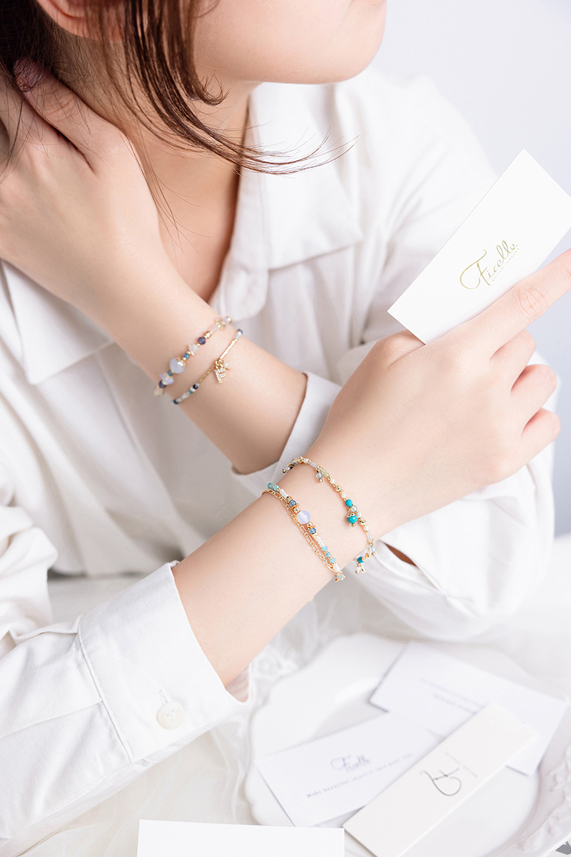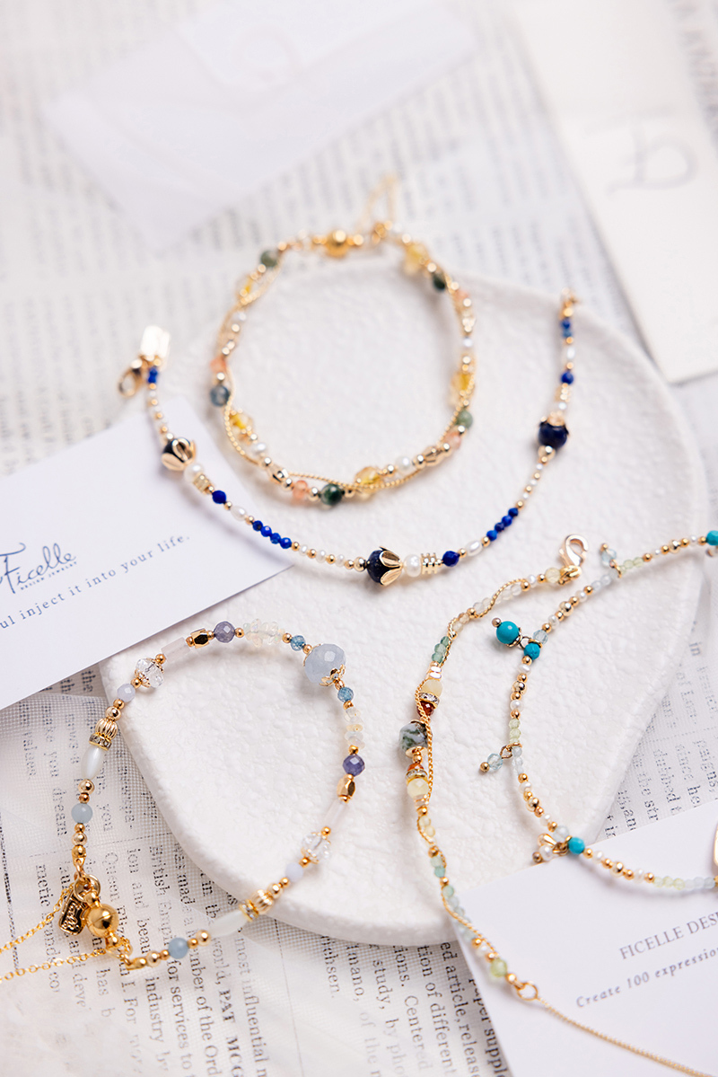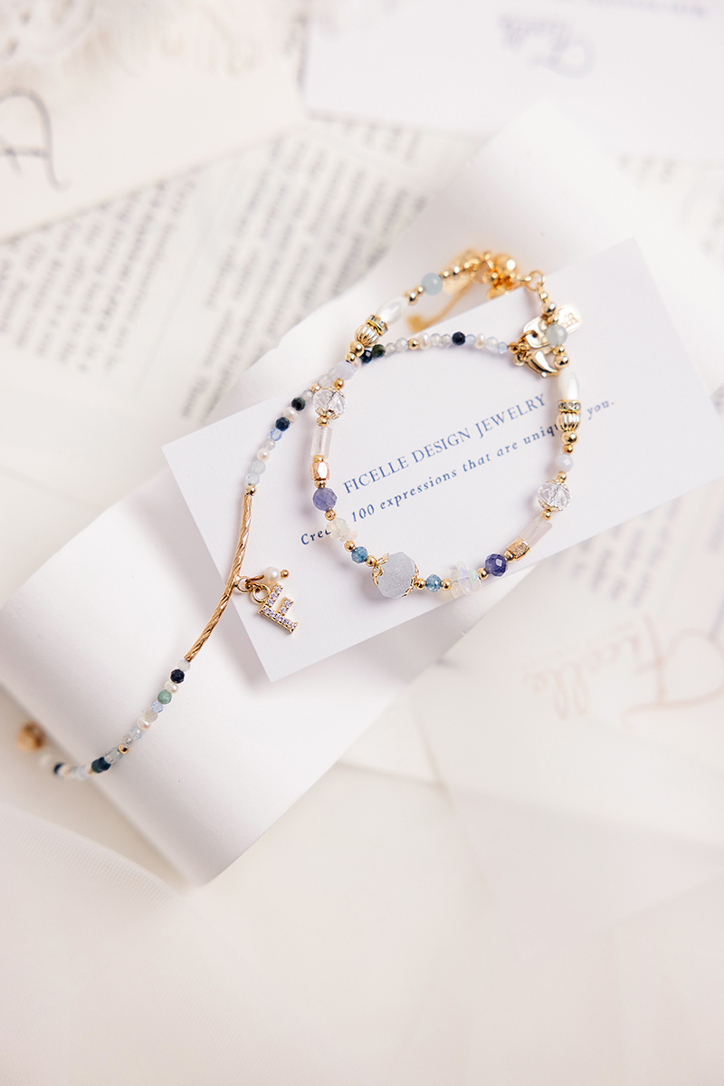 海藍寶、藍鋯石、蛋白石、堇青石、粉晶、白水晶、藍紋瑪瑙、白蝶貝、黃銅鍍18K金