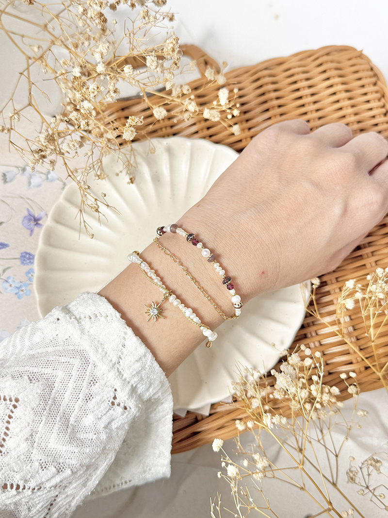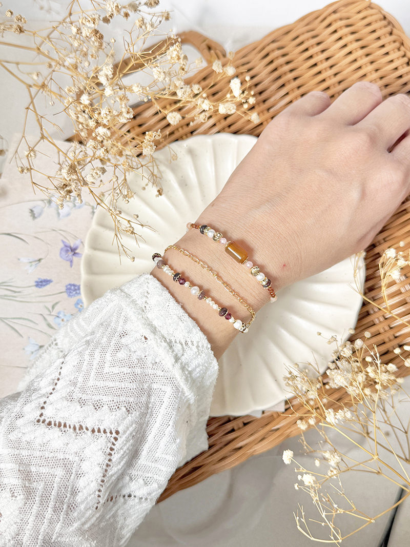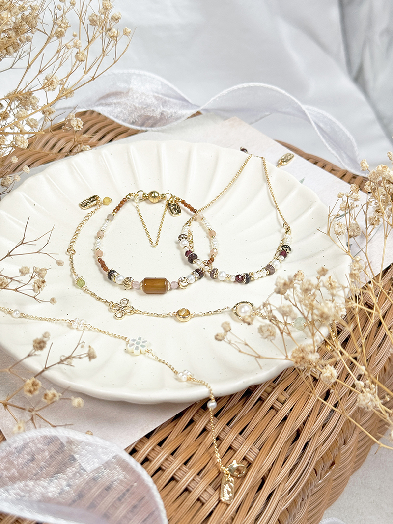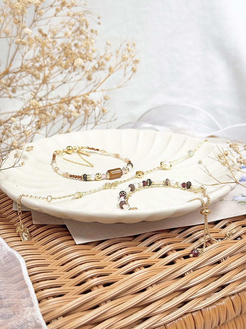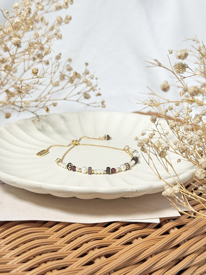 石榴石、淡水珍珠、草莓晶、紅花碧玉、黃銅鍍18K金