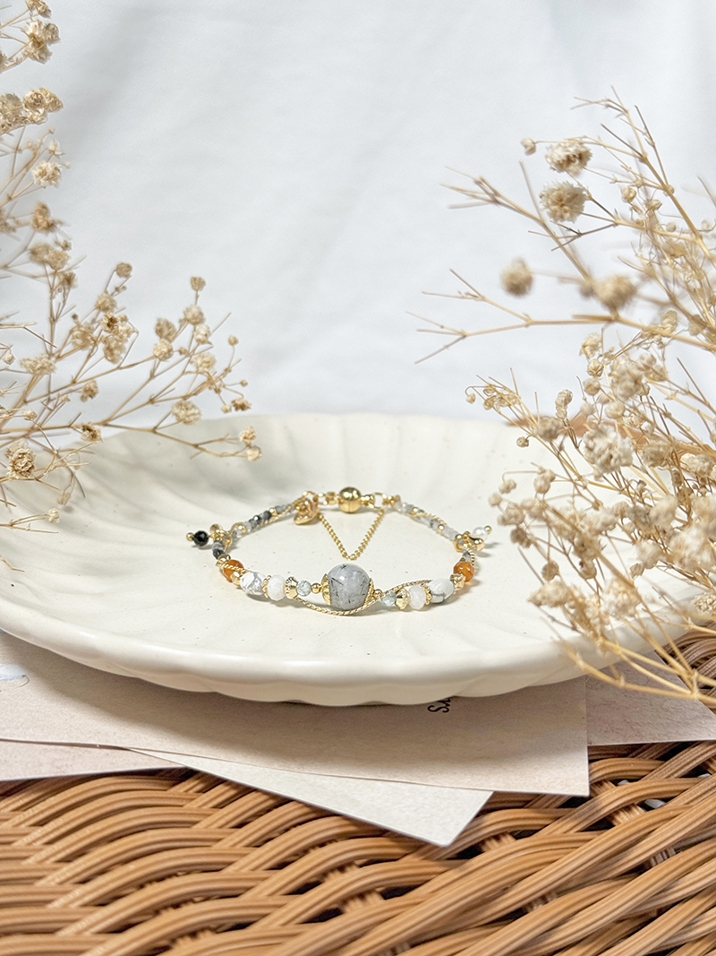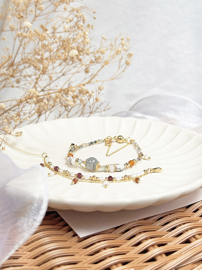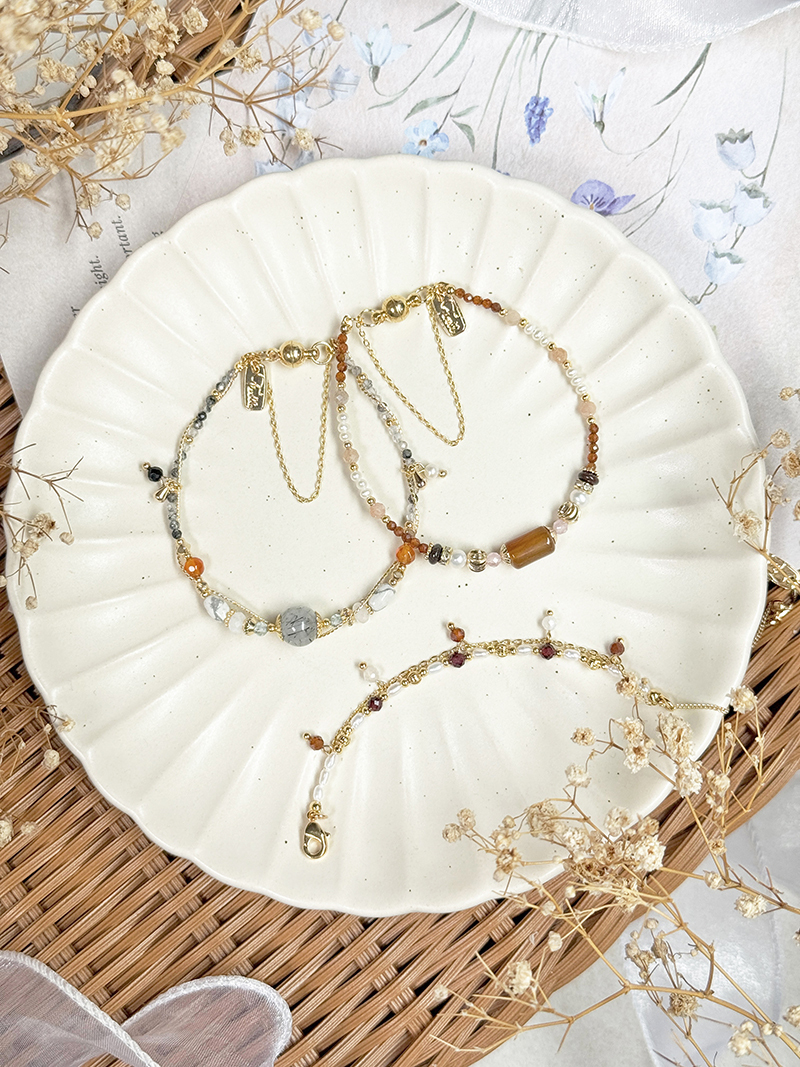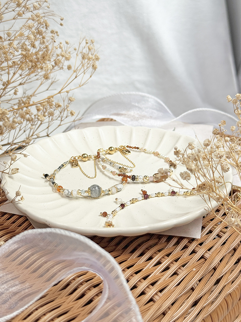 黑髮晶、磷灰石、月光石、白紋石、紅瑪瑙、淡水珍珠、尖晶石、黃銅鍍18K金
