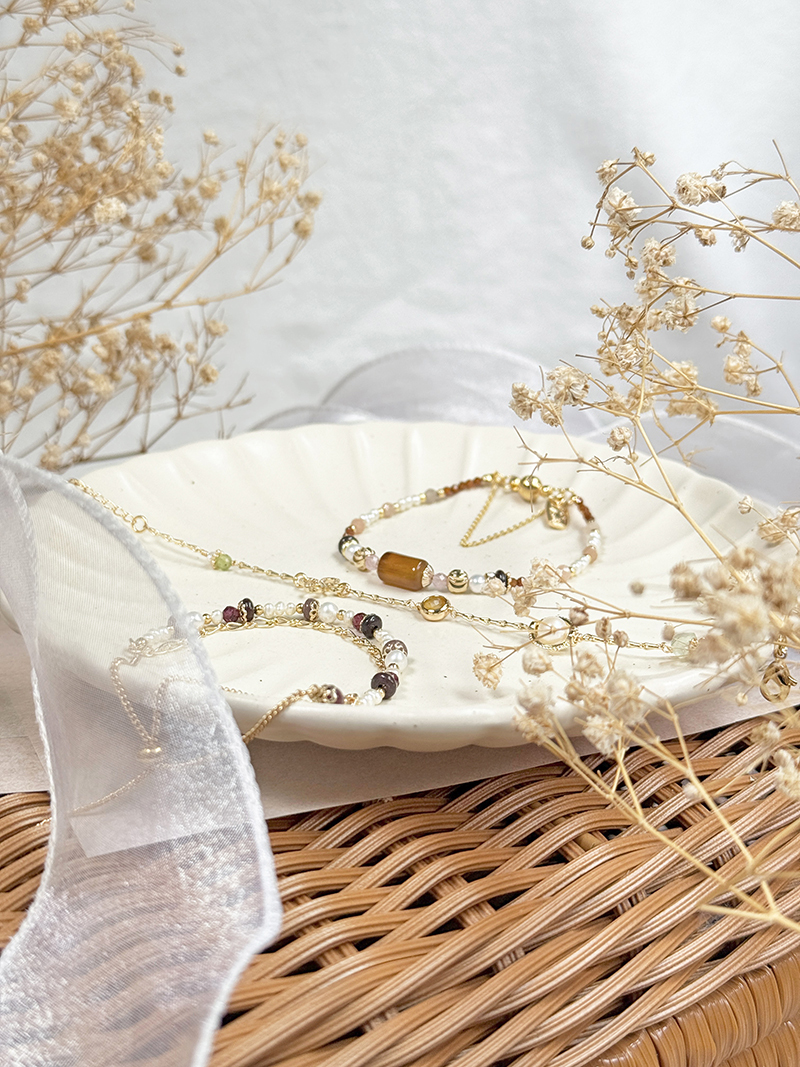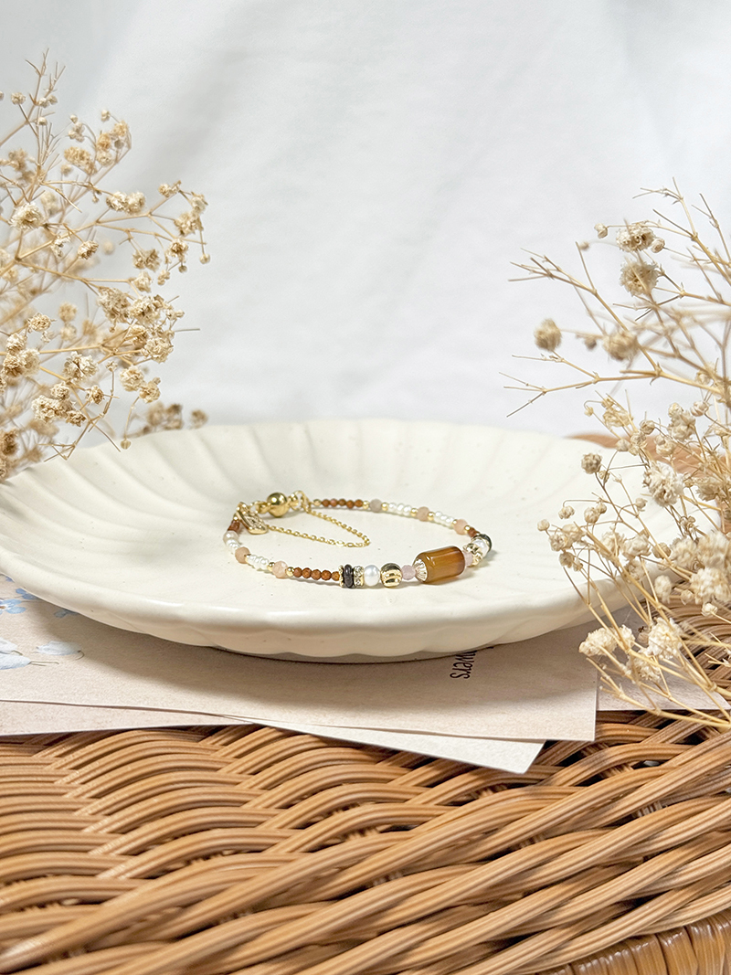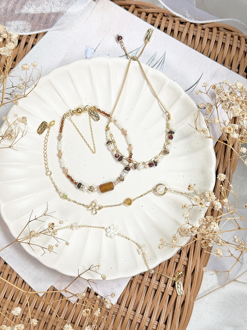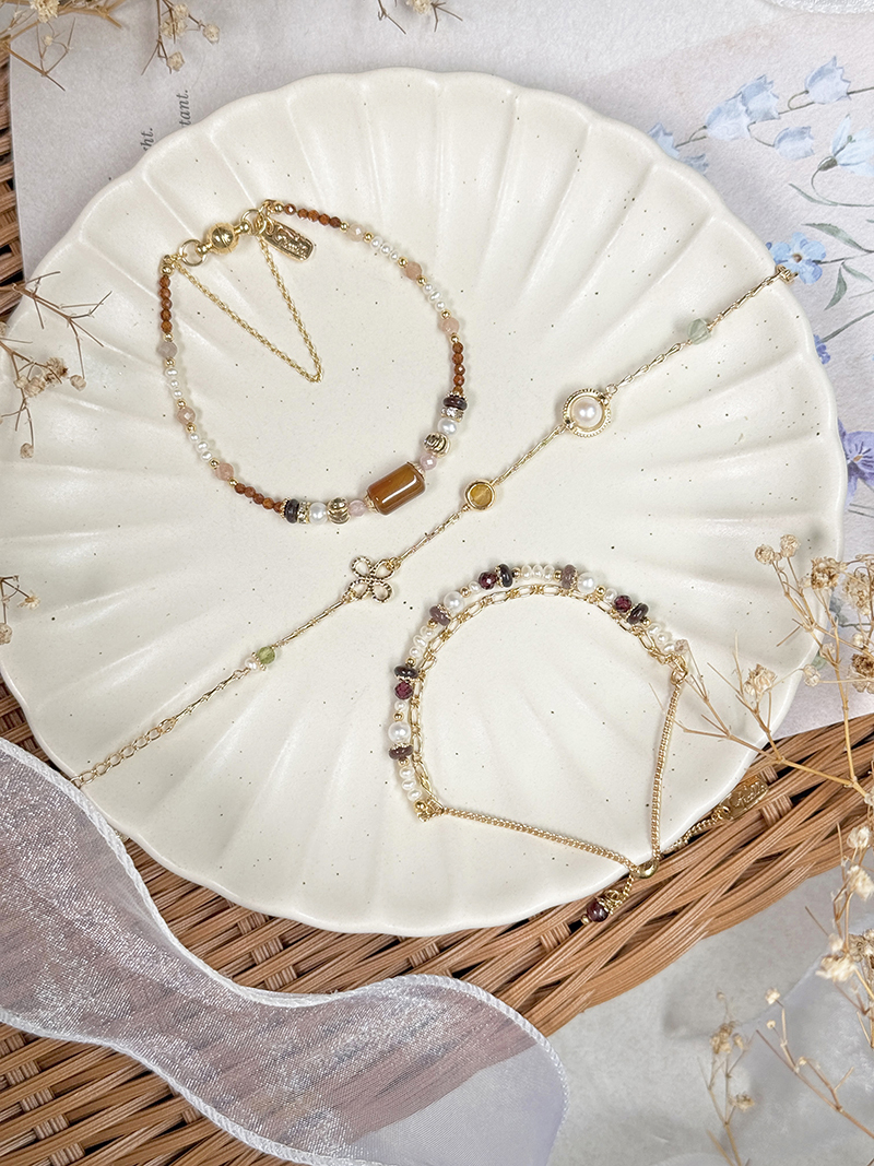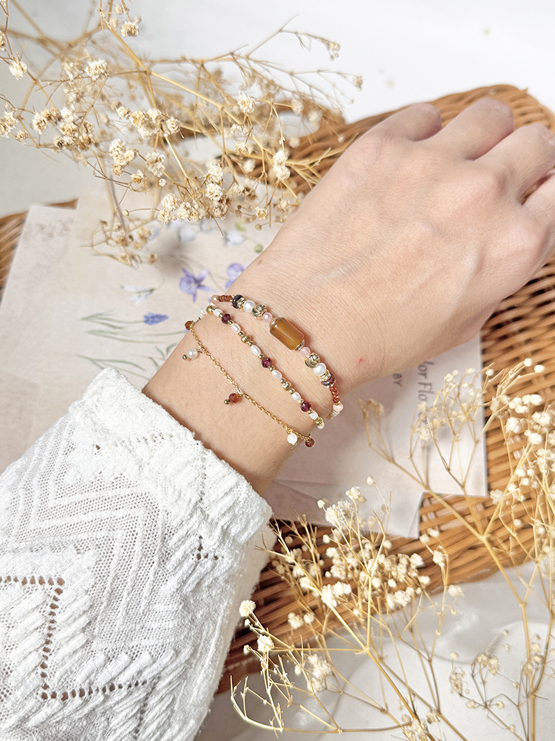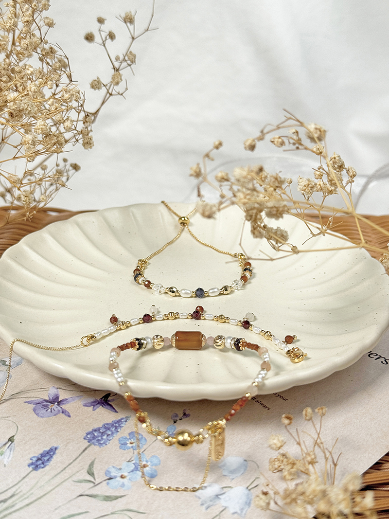 紅瑪瑙、粉貓眼石、淡水珍珠、紅花碧玉、橙石榴石、太陽石、黃銅鍍18K金