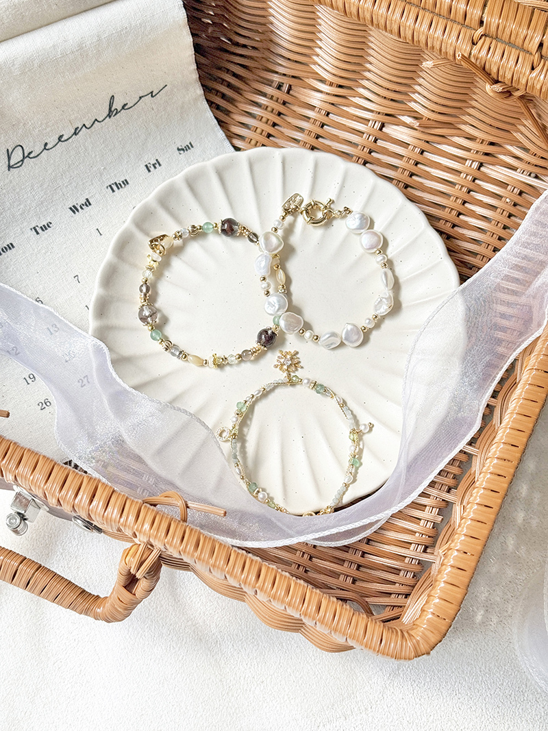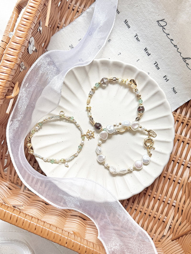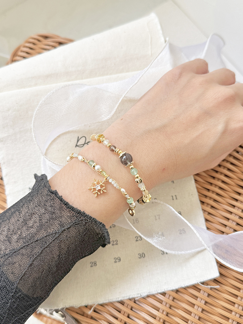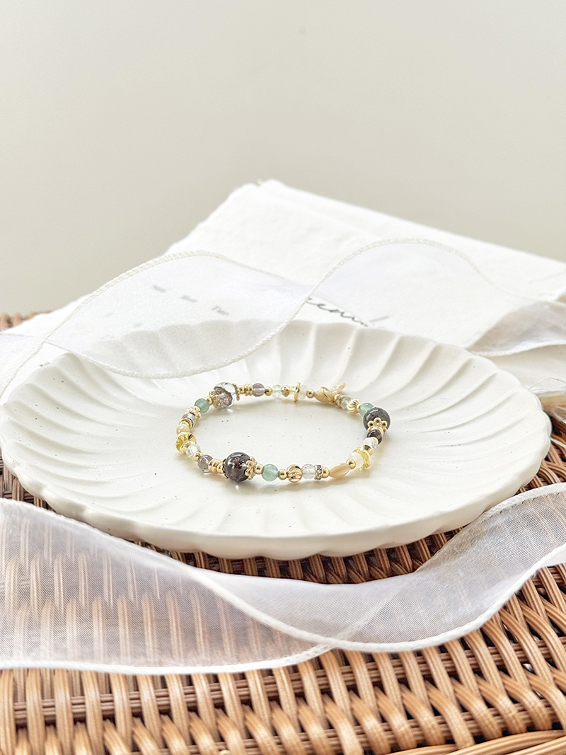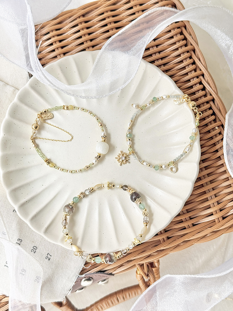 綠幽靈、東陵玉、茶晶、葡萄石、蝶貝、白玉、黃水晶、拉長石、黃銅鍍18K金