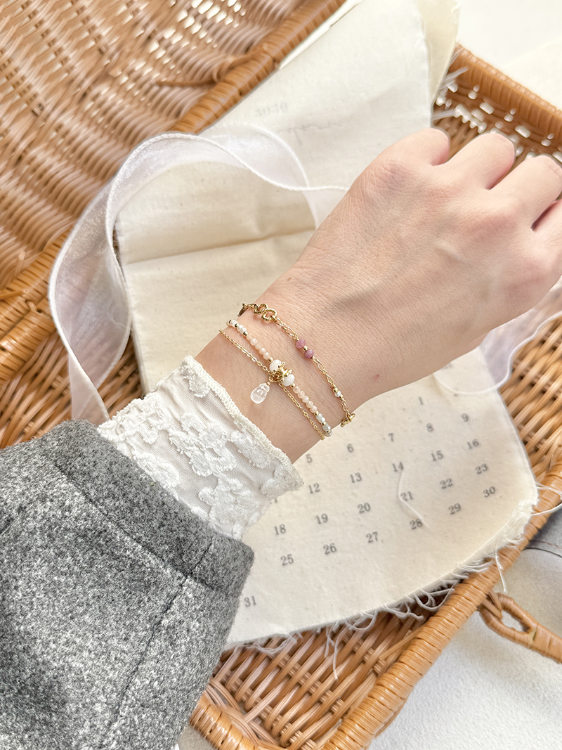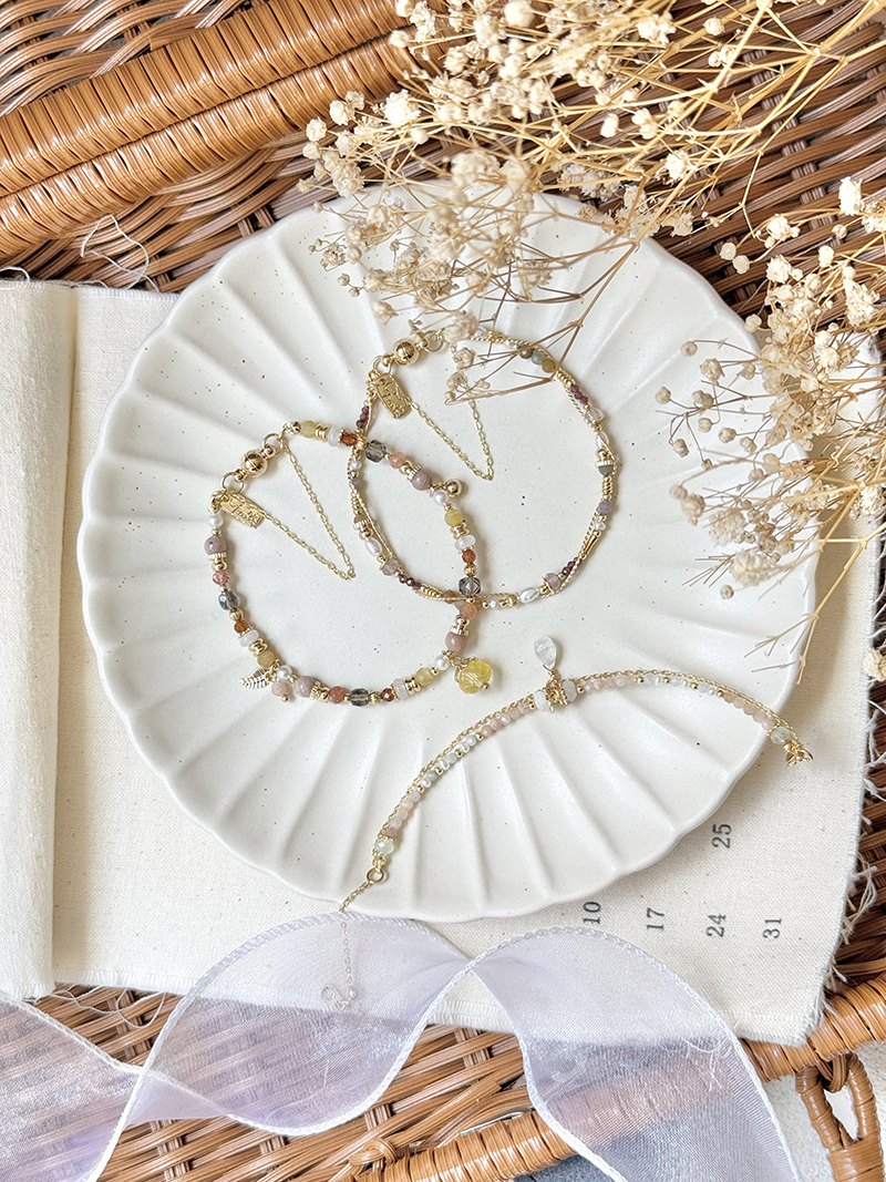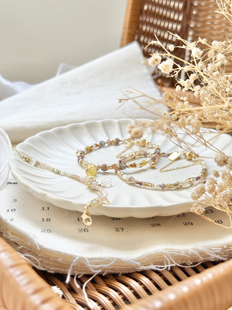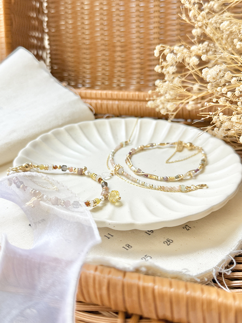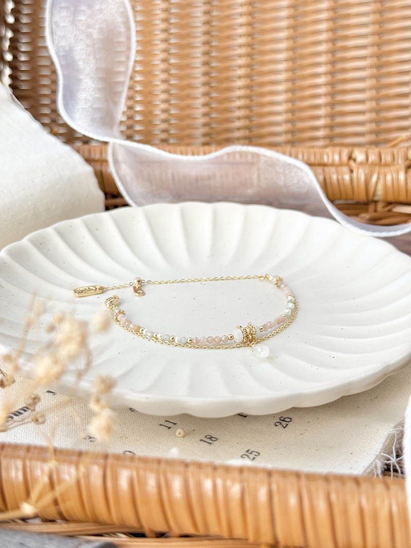 月光石、太陽石、緬甸玉、葡萄石、淡水珍珠、黃銅鍍18K金