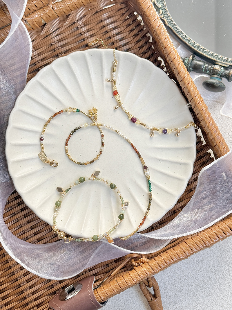 石榴石、紫水晶、紅瑪瑙、黃水晶、淡水珍珠、黃銅鍍18K金