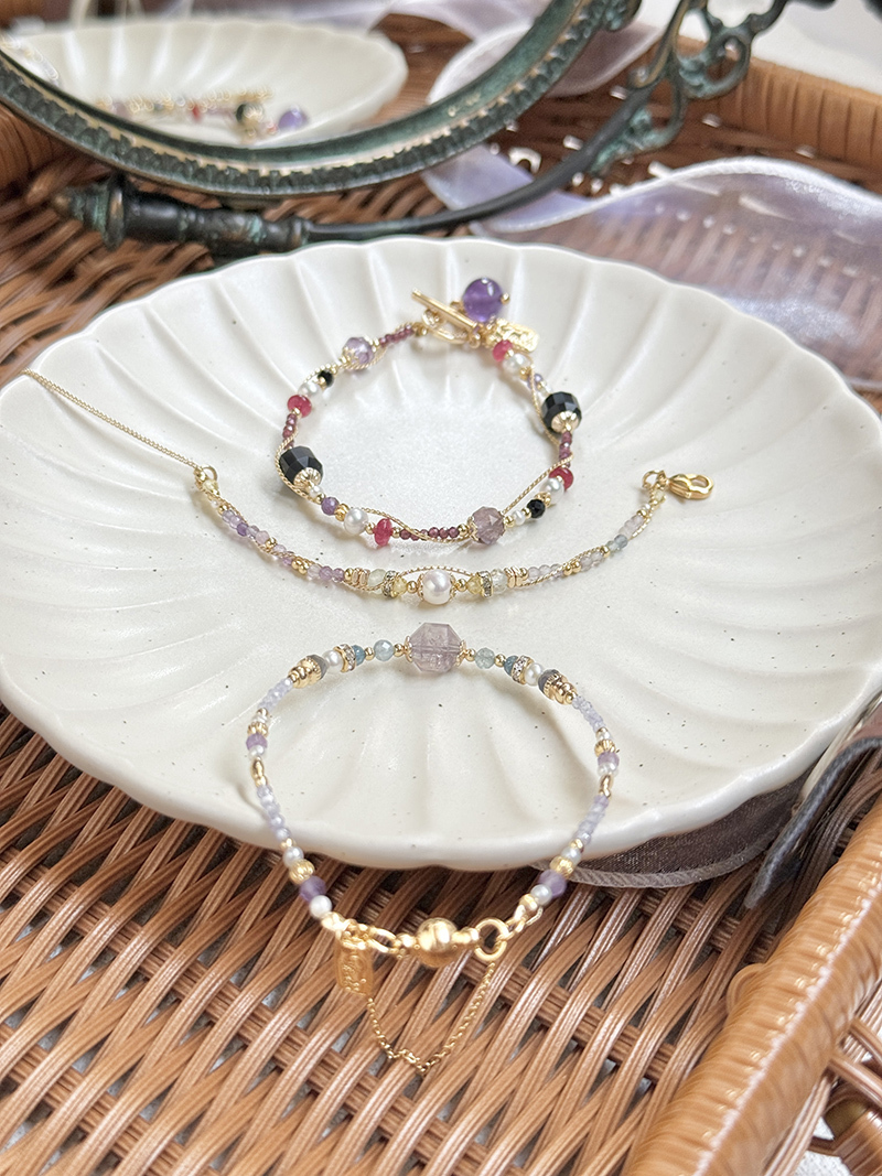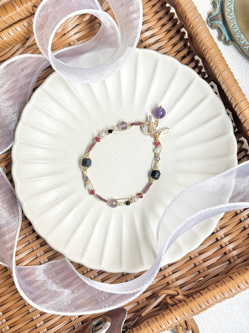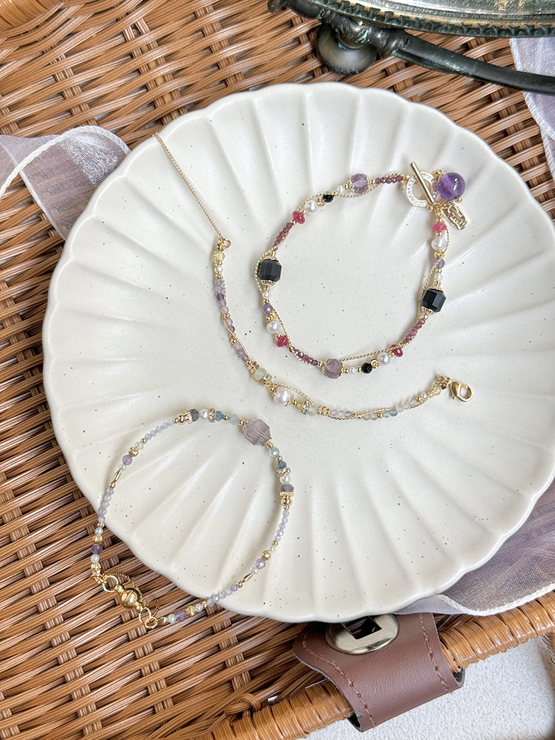 紫幽靈、黑曜石、紅花碧玉、石榴石、紫水晶、淡水珍珠、尖晶石、黃銅鍍18K金