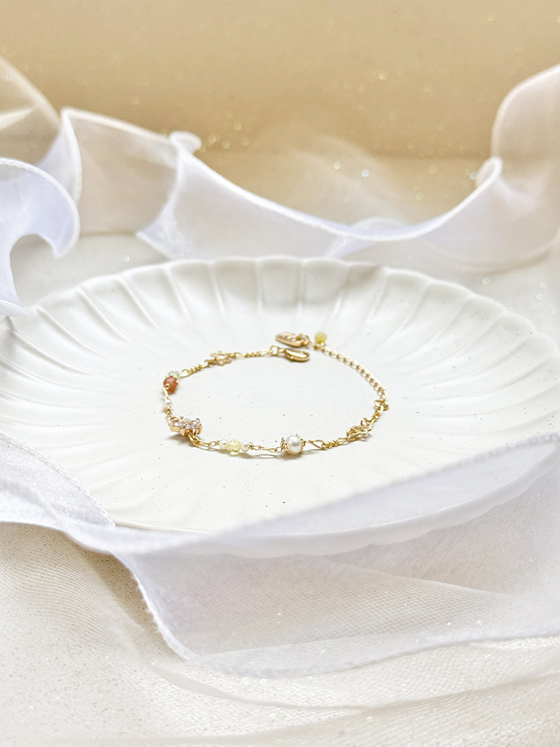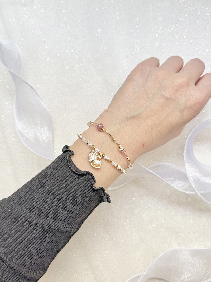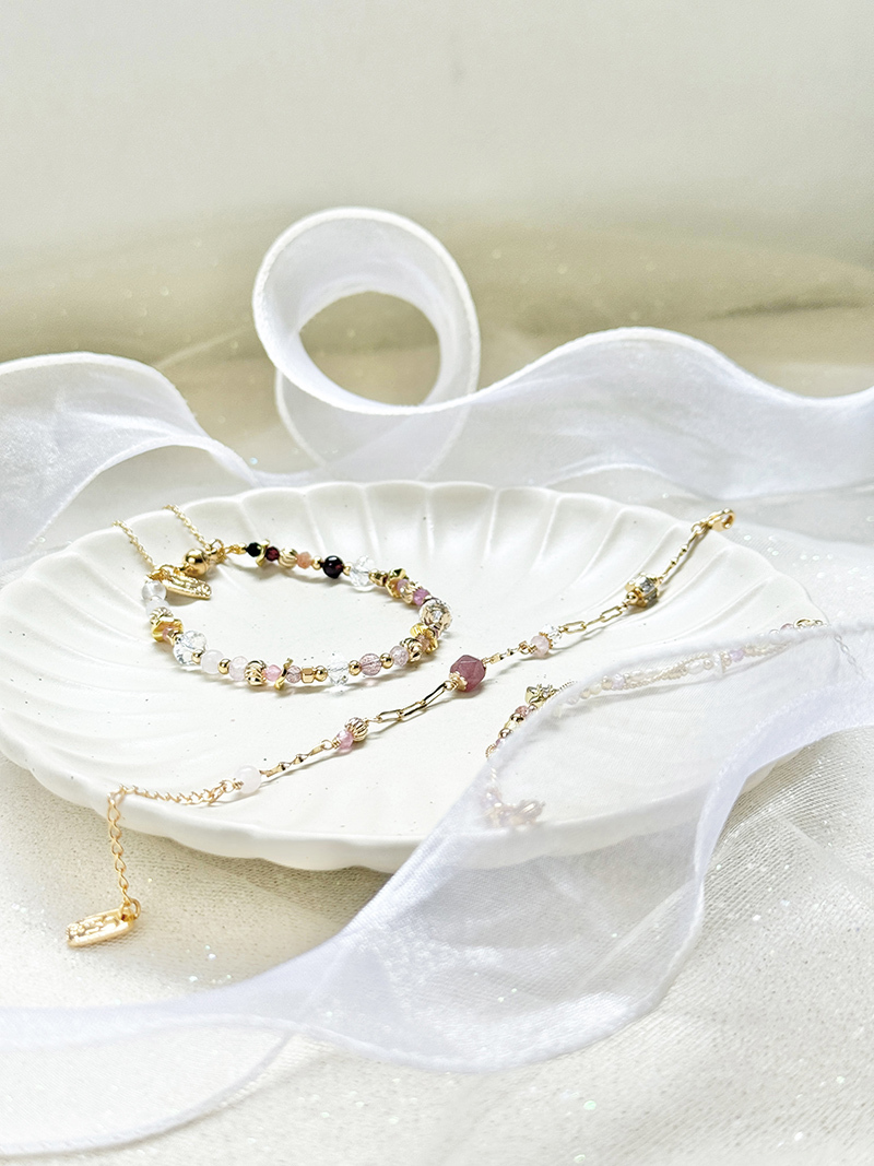 草莓晶、粉晶、白水晶、粉貓眼石、鋯石、黃銅鍍18K金