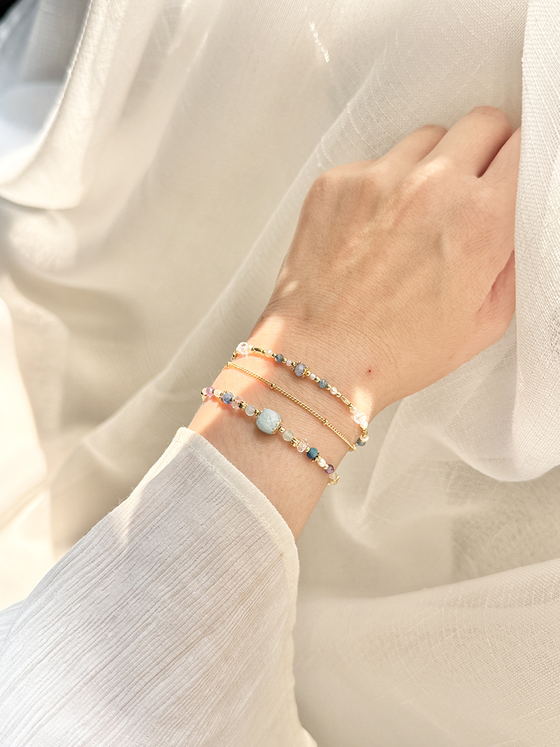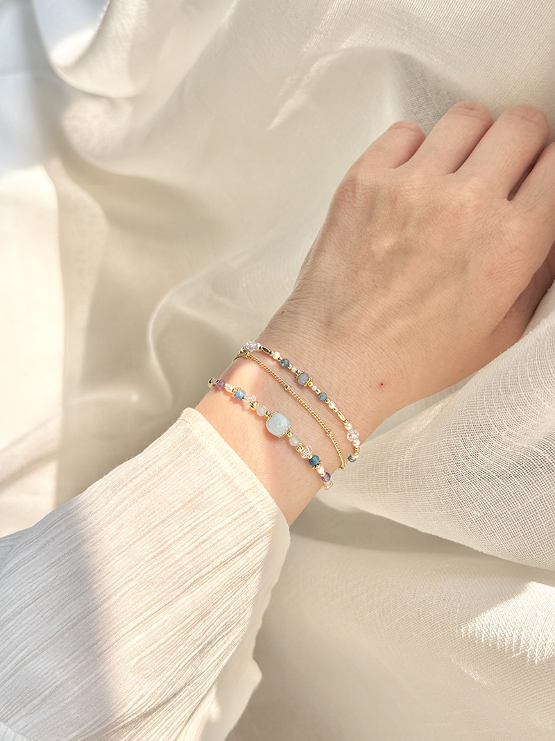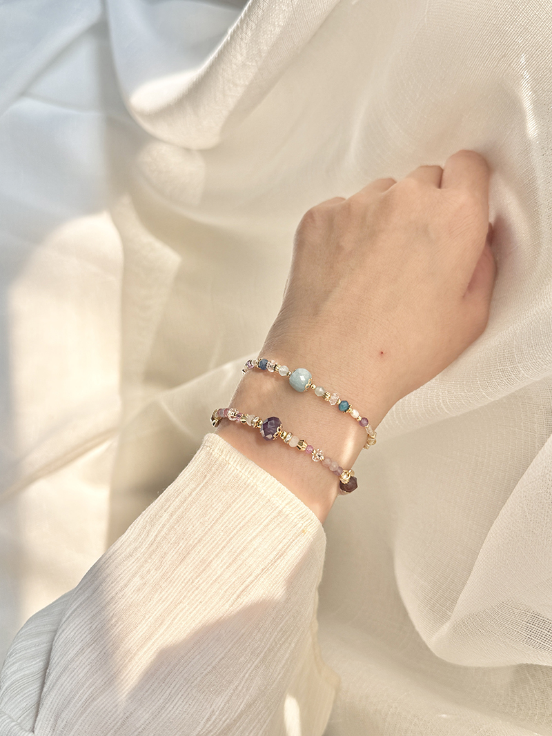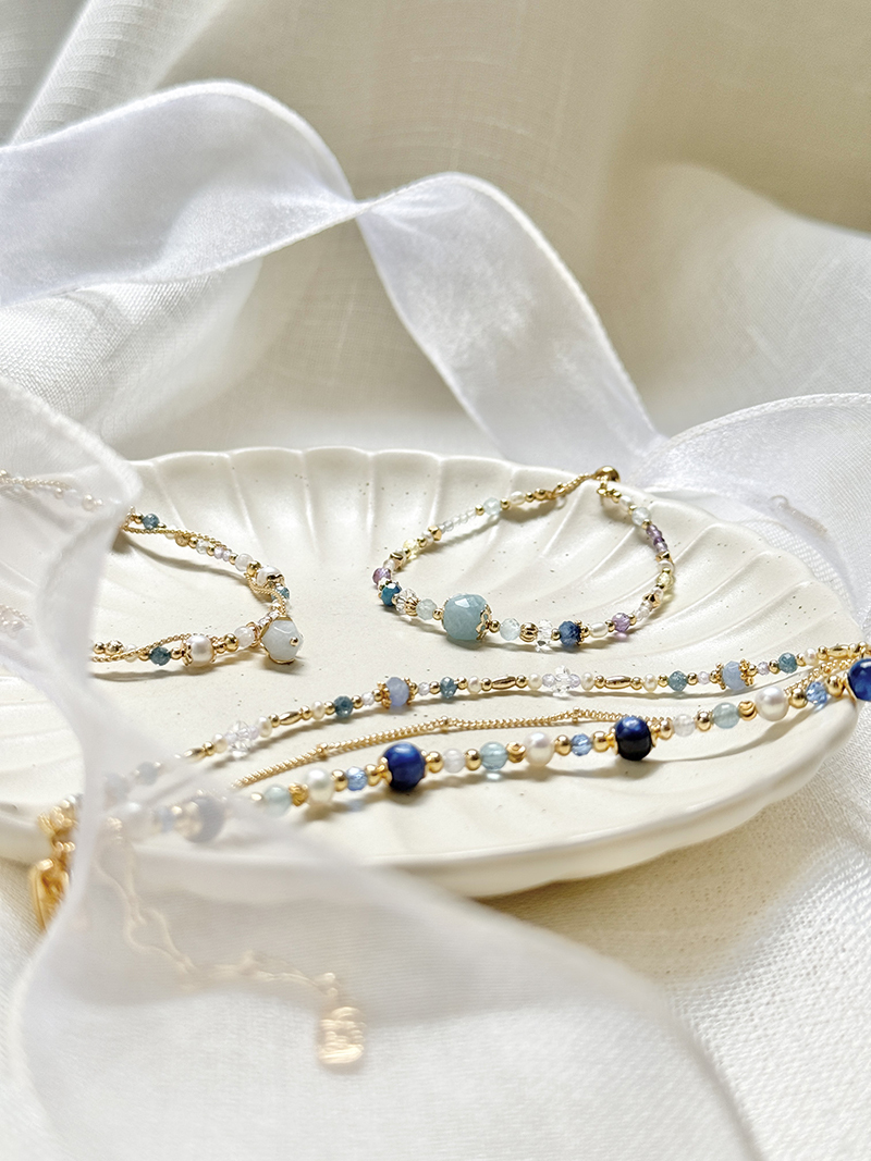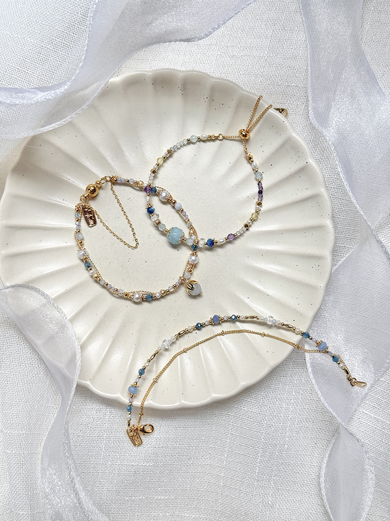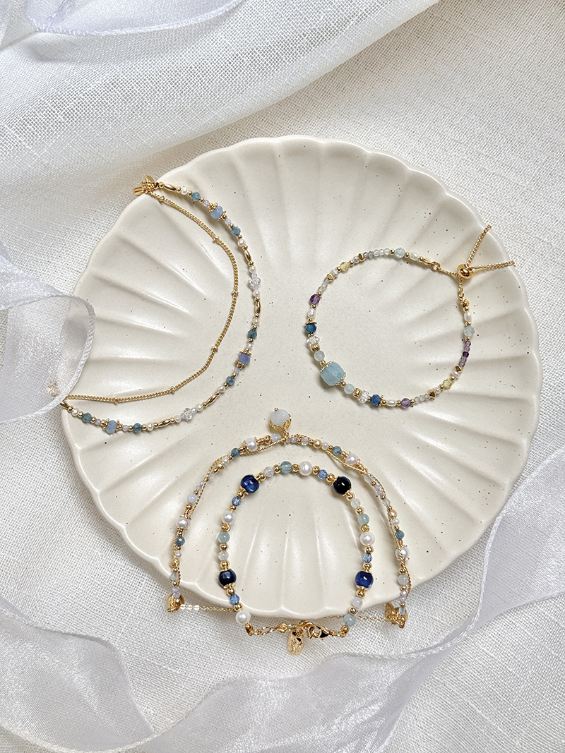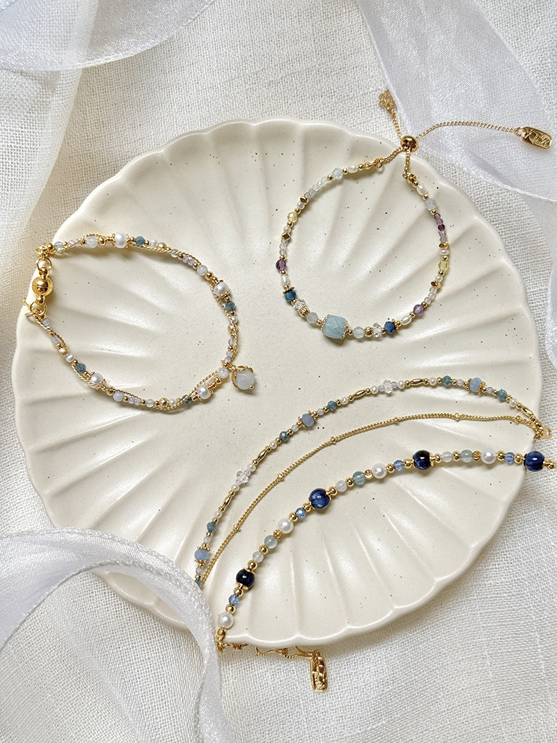海藍寶、藍晶石、紫水晶、白水晶、黃水晶、螢石、淡水珍珠、黃銅鍍18K金