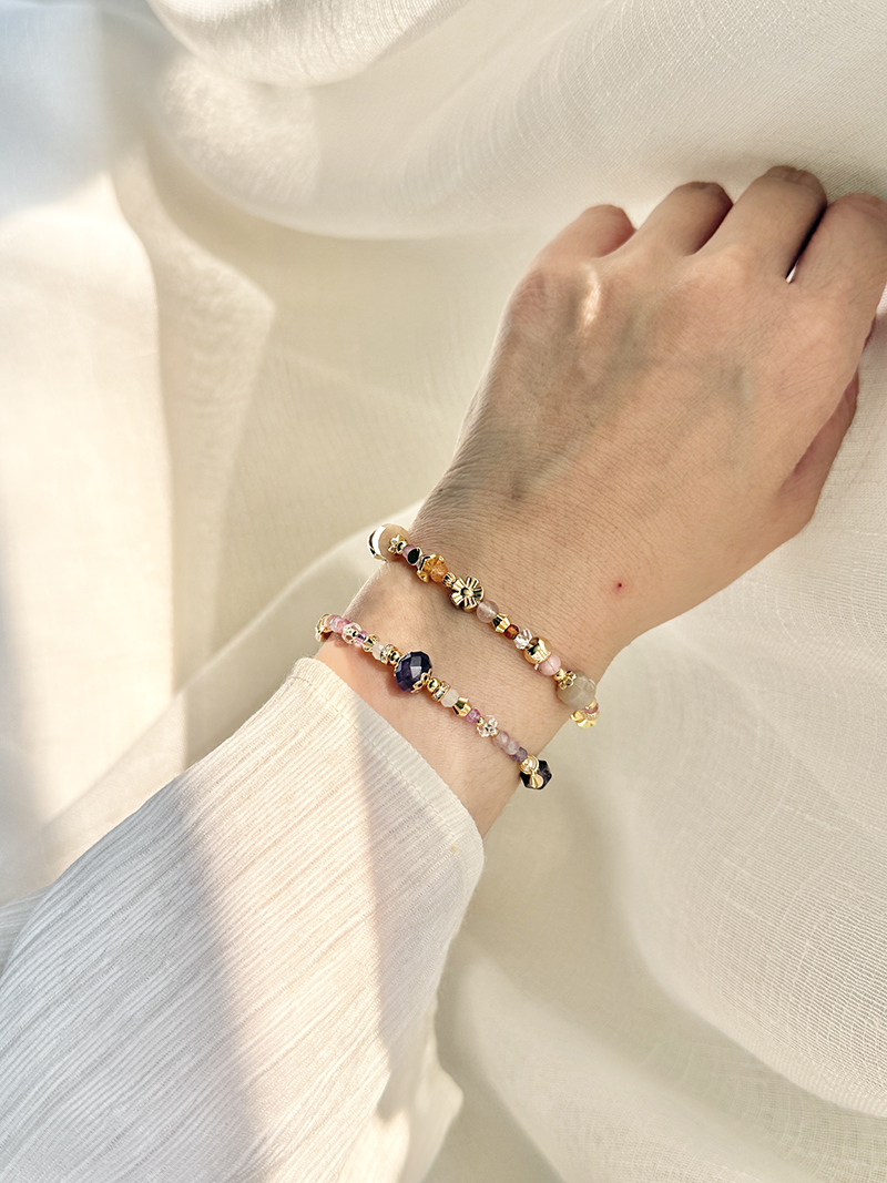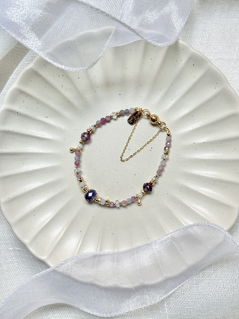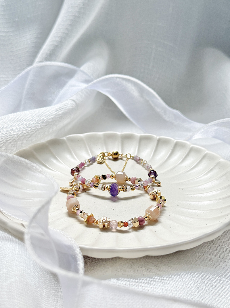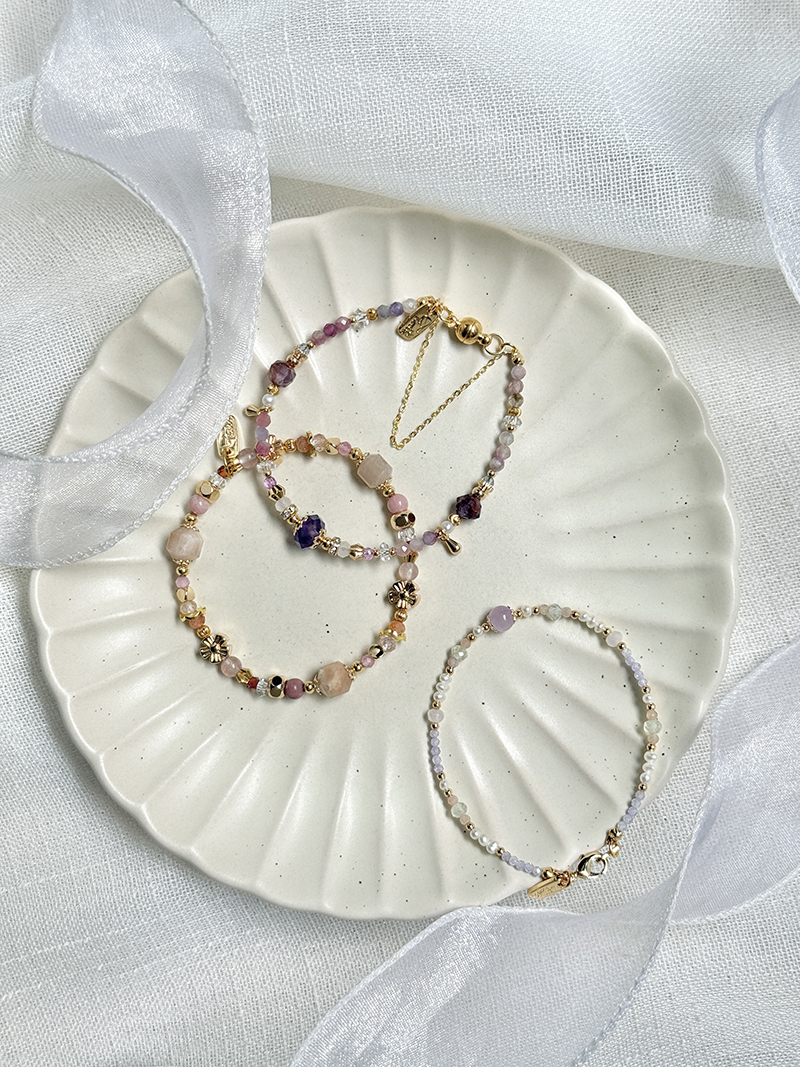紫水晶、馬卡龍碧璽、紫幽靈、白水晶、粉晶、托帕石、淡水珍珠、黃銅鍍18K金