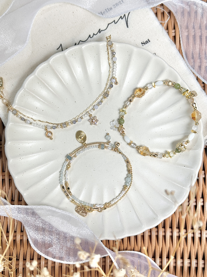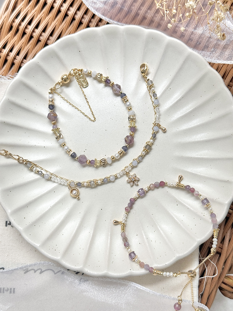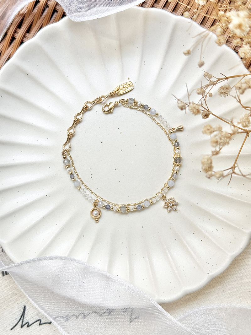 拉長石、淡水珍珠、堇青石、藍紋瑪瑙、白水晶、鋯石、黃銅鍍18K金