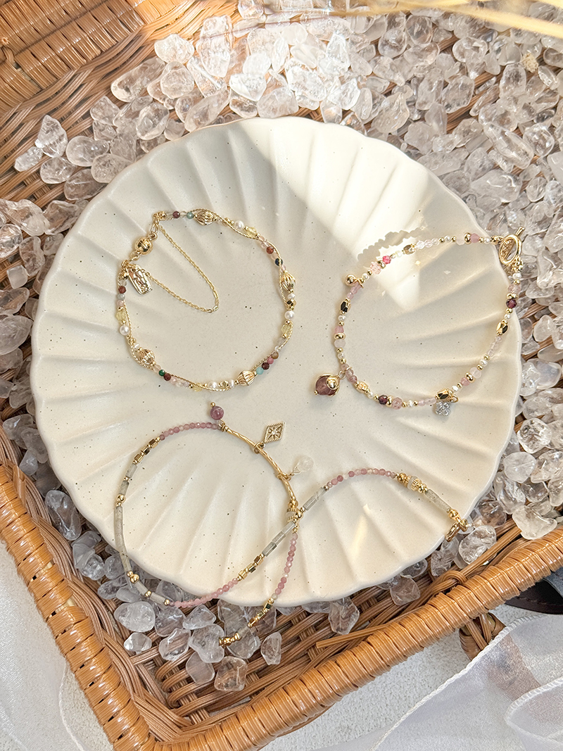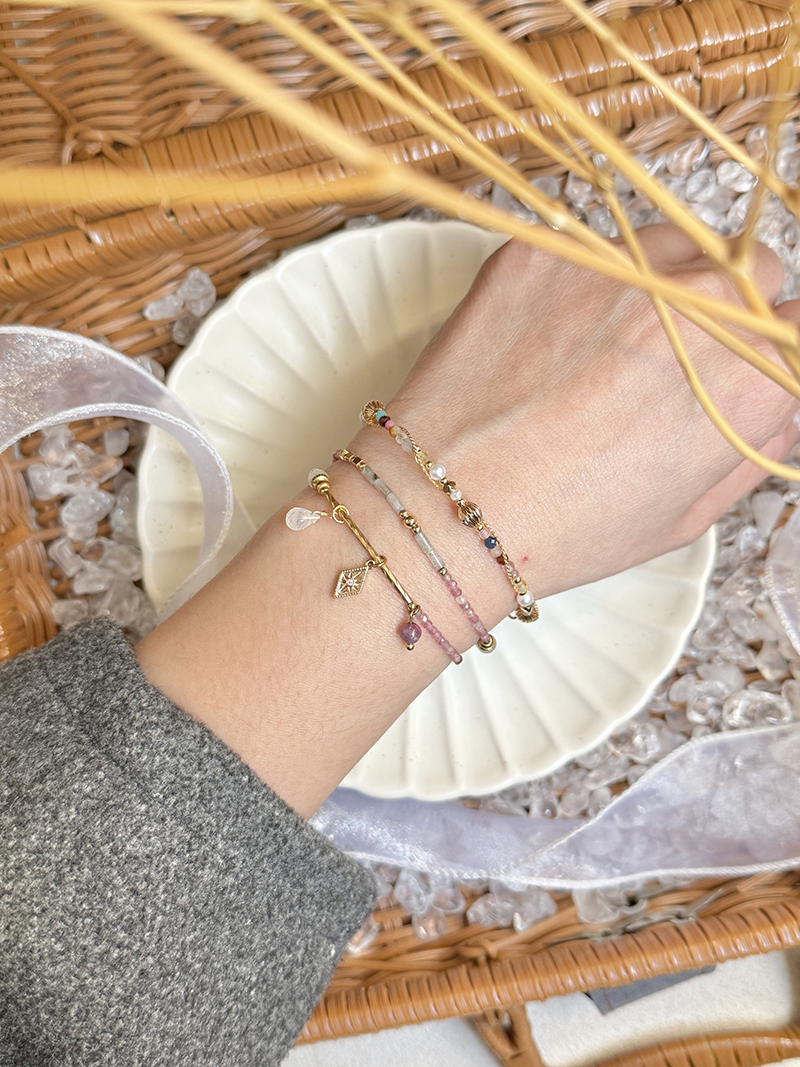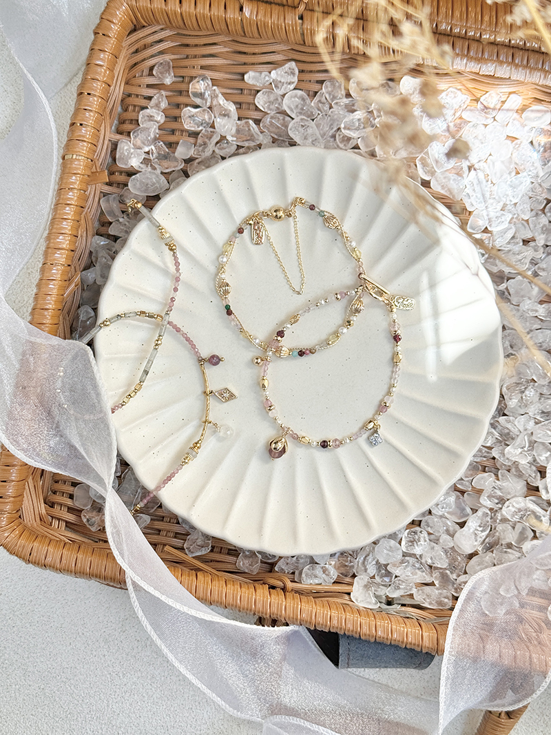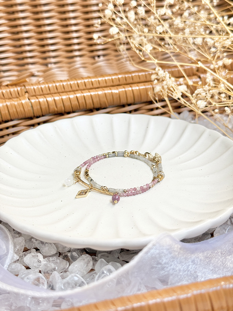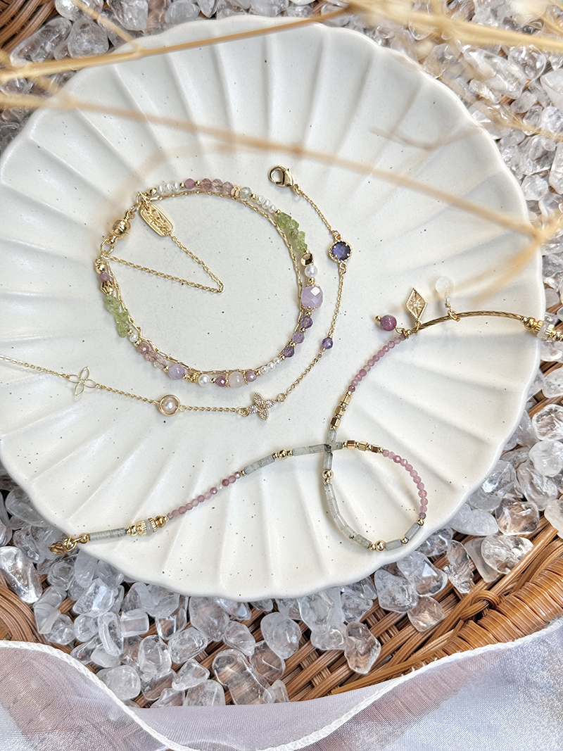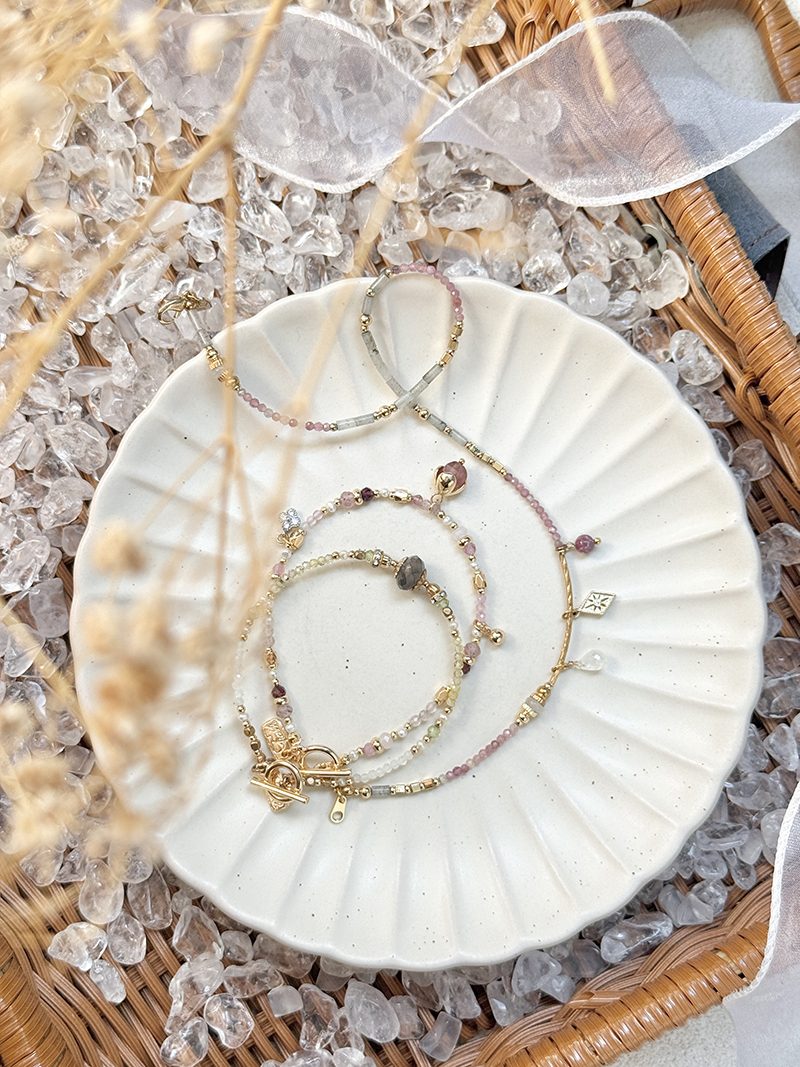 漸層粉碧璽、拉長石、月光石、白玉、黃銅鍍18K金