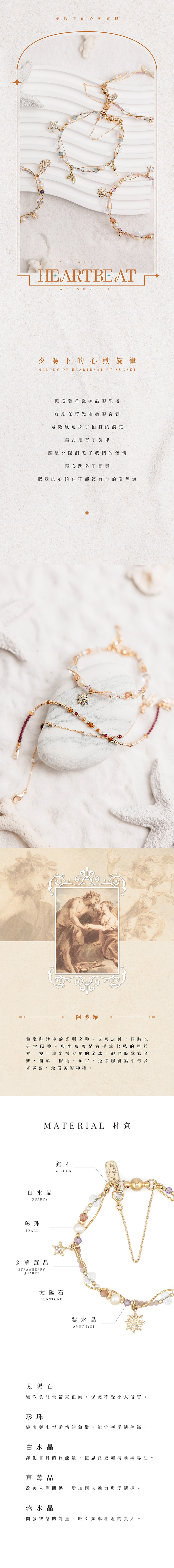 太陽石、淡水珍珠、白水晶、金草莓晶、紫水晶、鋯石、黃銅鍍18K金