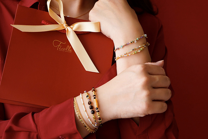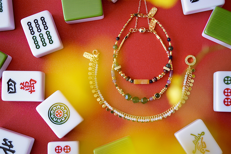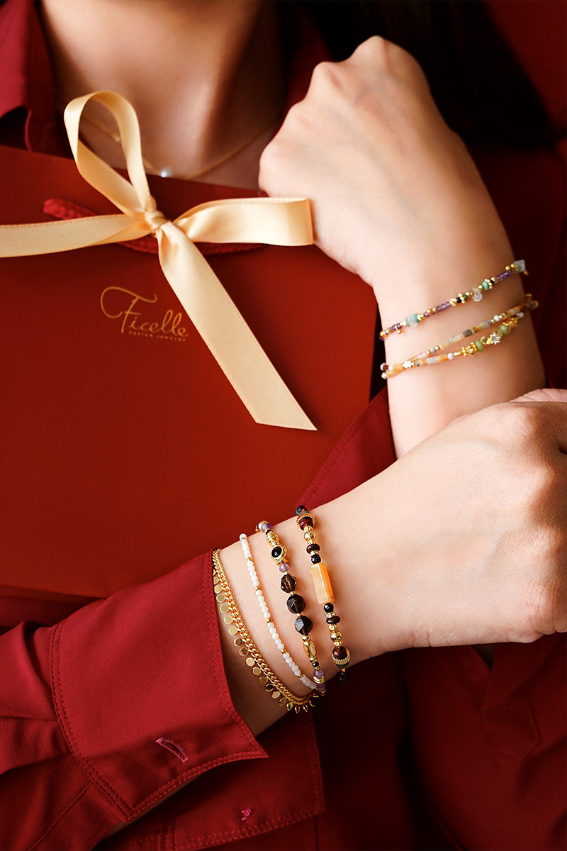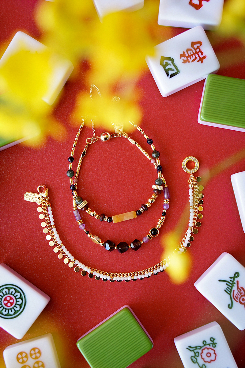 黃玉、水草瑪瑙、藍金沙、紅花碧玉盤珠、14K包金微鑲鋯石滾鑽