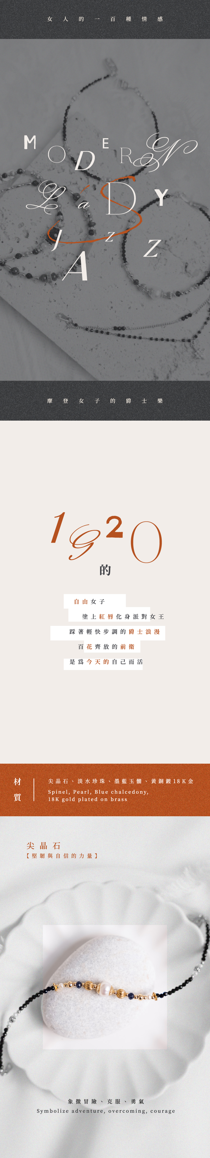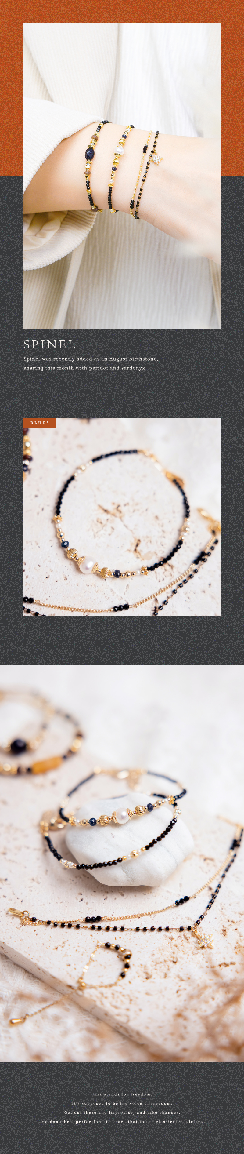 尖晶石、淡水珍珠、墨藍玉髓、黃銅鍍18K金