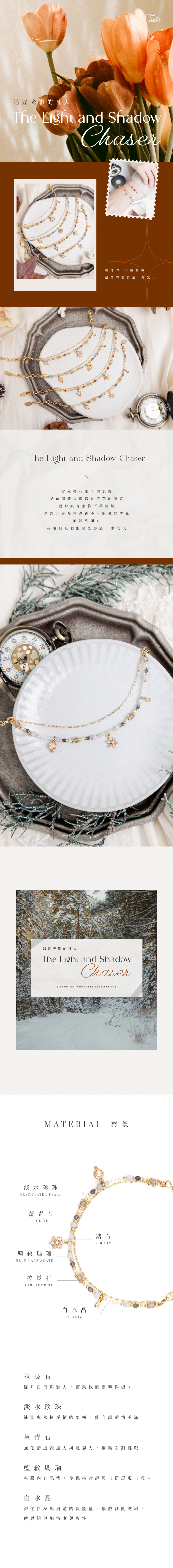 拉長石、淡水珍珠、堇青石、藍紋瑪瑙、白水晶、鋯石、黃銅鍍18K金