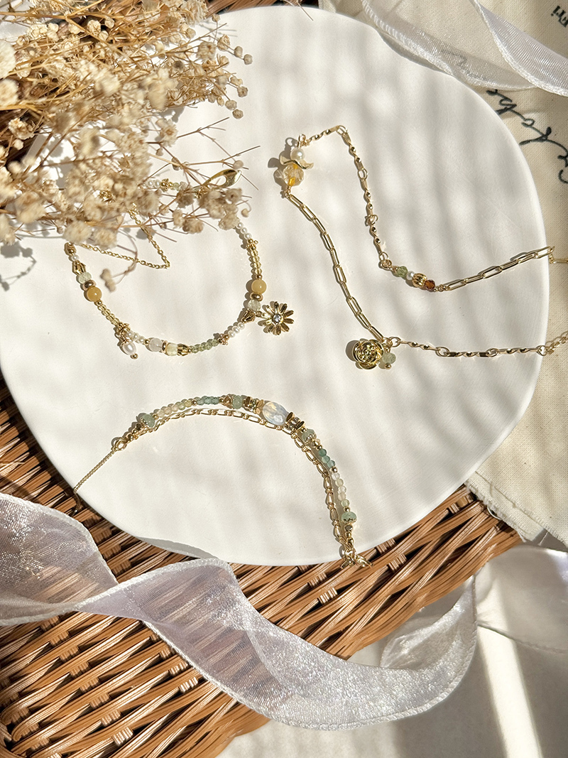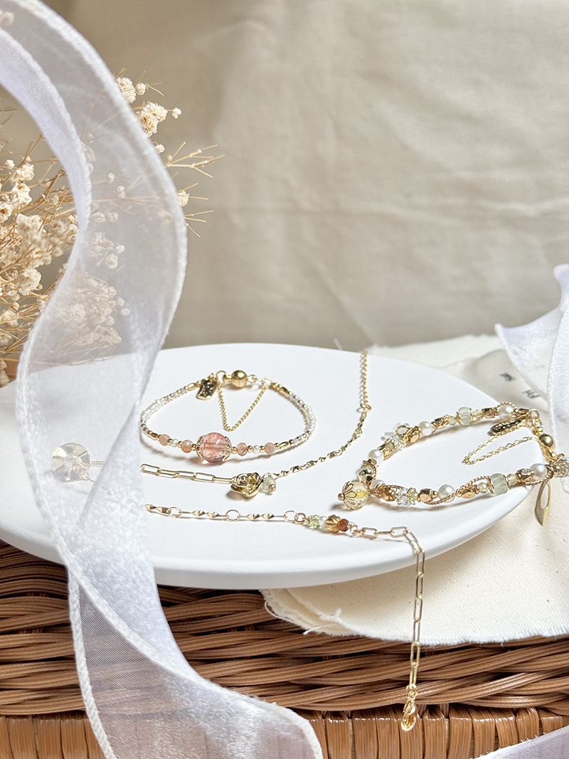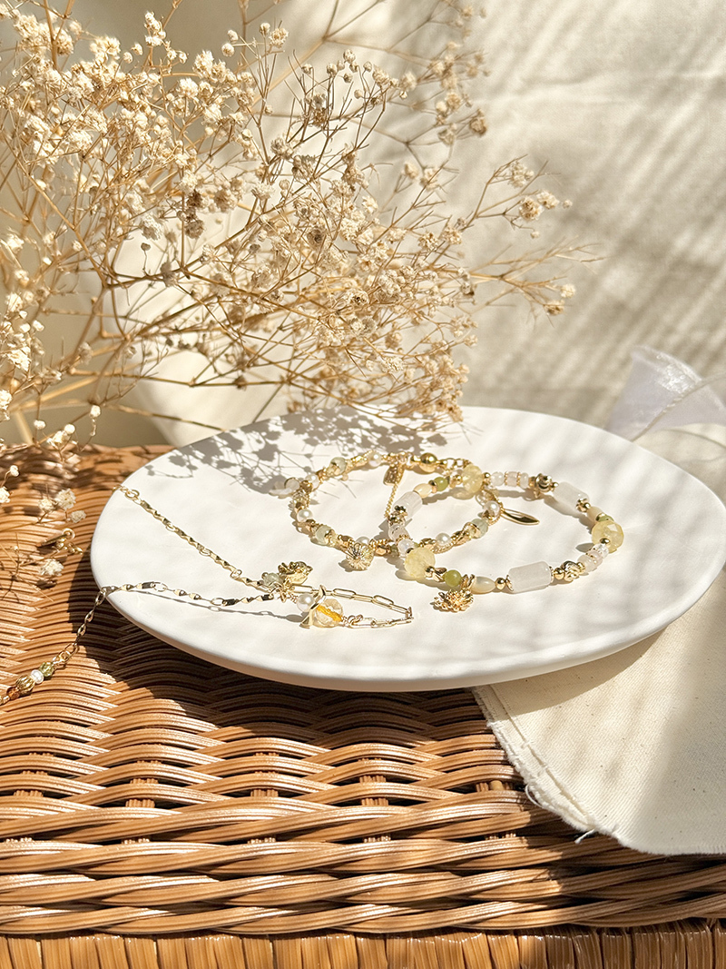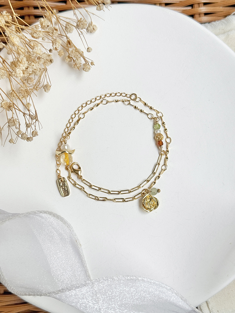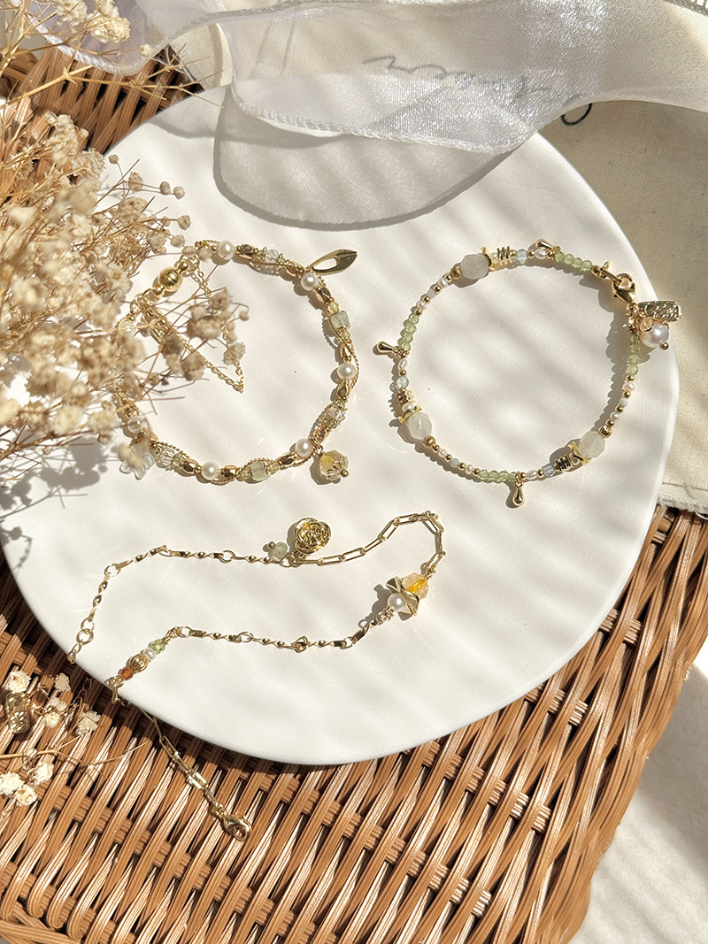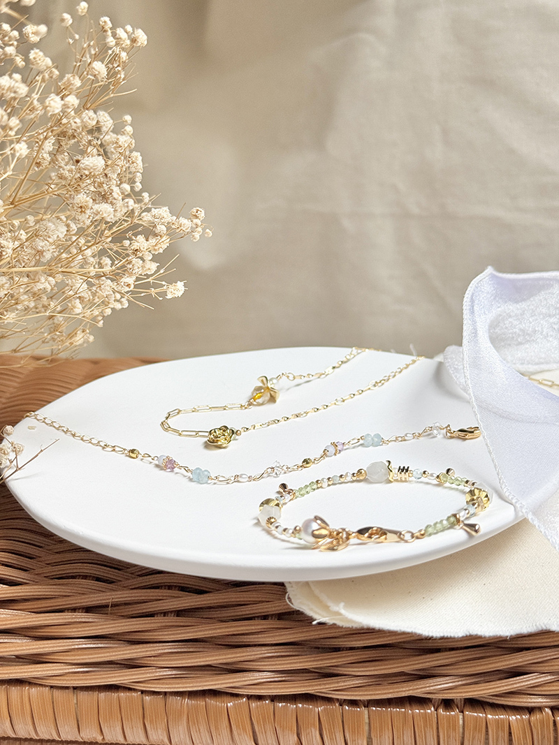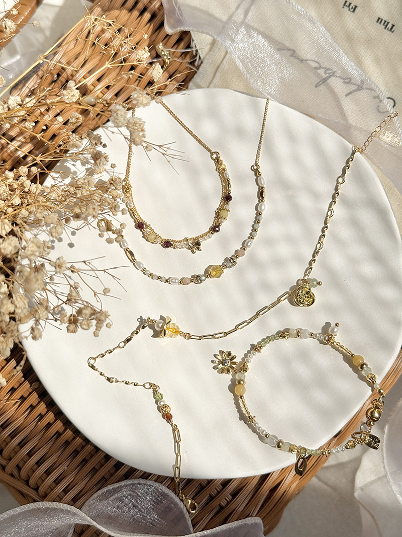 黃水晶、葡萄石、橙石榴石、橄欖石、淡水珍珠、黃銅鍍18K金